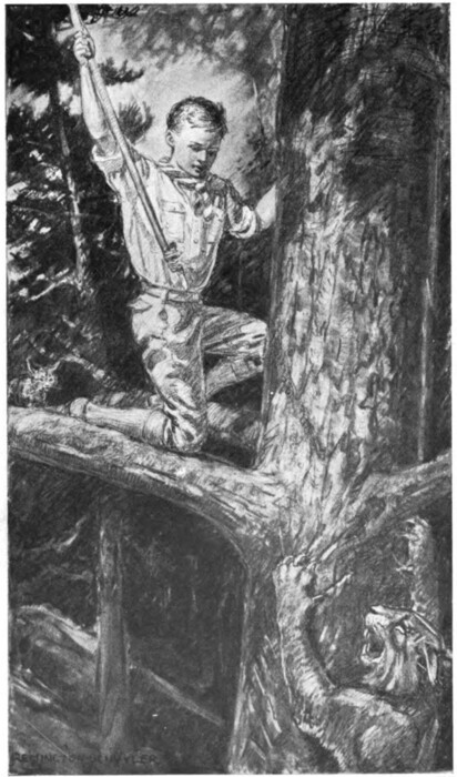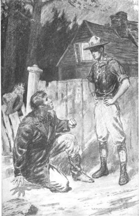 So Master Gordon Lord walked slowly up the quiet, suburban street until the roof of his own home was visible through the trees. He had finished his apple, and he now sent the core spluttering against a tree. The scout smile had gone under a cloud for the time being, for the boy now began to realize the extent of his disappointment. There was not another boy in sight. Ordinarily Arnold would have been mowing the lawn or attending to some other outdoor work about the place at this time; but there was no Arnold in sight now, and he seemed doubly absent because Gordon knew where he had gone. Then his disappointment began to take the form of anger, and even his anger was not well-directed, for it included the very boy who had made him a scout and who had helped him into the second class. But the thought that both patrols would soon be rushing gayly up the Hudson while he trudged homeward in an almost boyless Oakwood was too much for him, and he sat down on a rock along the stretch of road between his own home and the Arnold house and blamed them all and told himself that Arnold was a “lobstereen”—whatever may be the meaning of that dreadful appellation.