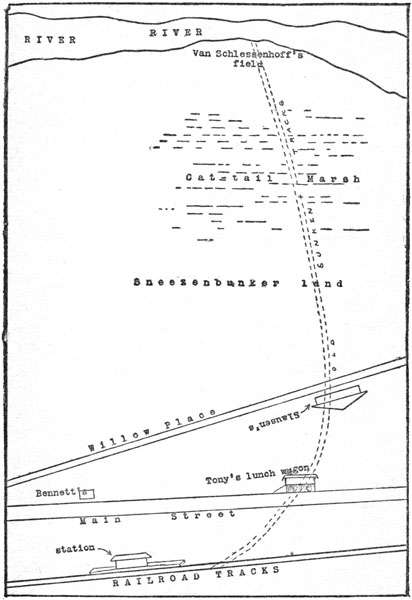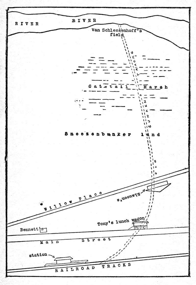 He owned that field down by the river that we were talking about. There is an old railroad track from that field right up to the Bridgeboro station, so they could send lumber away. It’s all old and rusty and broken in lots of places, and the piles are all kind of rotten where it goes across Cat-tail Marsh. Up in town it’s all buried in the dirt, sort of, but you can see the old rails good and plain where they go across Main Street. You can find those rails where they go across Willow Place, too, and they run right under Slausen’s Auto Repair Shop and across the yards in back. You can pick out those rusty old rails underneath the long grass all the way across the Sneezenbunker land and almost right up to the station. One Saturday we picked them out all the way, just for fun. I guess there wasn’t much to Bridgeboro when those tracks were used.
