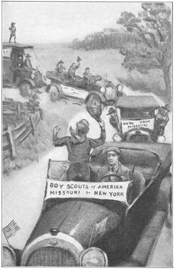 So now I guess I’ll start. The next morning who should show up but Brent Gaylong. He didn’t even bother to wire. He said he didn’t believe in telegrams and things like that when it came to adventures. He’s awful funny, that fellow is—kind of sober like. He’s head of a troop up in Newburgh and we met him when we were on a hike once. He can drive a Ford so easy that you don’t know it’s moving. He says most of the time it’s not moving. He’s crazy about adventures. Good night, when he and Harry Domicile start talking, we have to laugh. He said he’d do anything provided we got into trouble. Harry told him there ought to be plenty of trouble between Missouri and New York. That fellow tries awful hard to get arrested but he never can.
