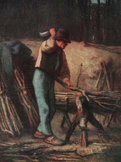 It may safely be said that as a painter, purely and simply, Millet will never occupy a very high position in the world of art. He never bursts forth into any of those pyrotechnics which distinguished many of his contemporaries and some[Pg 21] of the painters of our own days. His manner of handling the brush is always restrained to the point of timidity. By this I do not mean to imply that he could not paint in a large and bold manner; indeed on many occasions, as for example in the “Sawyers,” he has attained an astonishing degree of power. But as his whole thoughts were directed to suppressing any tendencies towards virtuosity, which might divert attention from the point he wished to illustrate, he frequently appears to achieve his ends by holding himself in restraint.