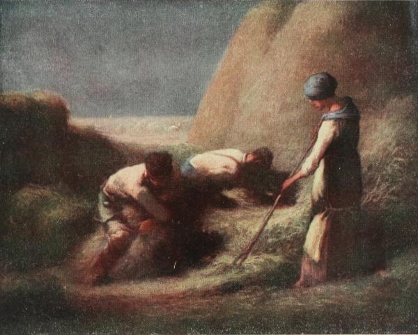Millet, on the other hand, was absorbed in the peasant. The man who tilled the soil and raised the produce humanity requires for its subsistence by the sweat of his brow; the manifold duties of the labourer, his life and sorrows, appealed to him with irresistible force. An unpeopled track of wild and uncultivated land would not call forth any emotion in him, no matter how sublime the scenery might be. The life of the village, spreading itself into the vast and fertile plain behind, held him absorbed; a peasant himself and living amongst the people he so loved, he was in a position to bring before an unthinking world the poignant monotony of their useful lives.