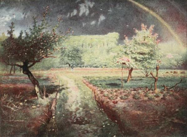 It is probable that Millet wished this picture to be regarded rather as a symbolical representation of Spring, than as an actual study from Nature. The storm that has just passed over has been severe, but of short duration. The sun, breaking through the dense banks of clouds, reveals the splendours of the water-sodden landscape; the apple-trees full of bloom, the verdantly green grass, the young foliage on the distant trees, all reveal the benefit they have received from the downpour.
