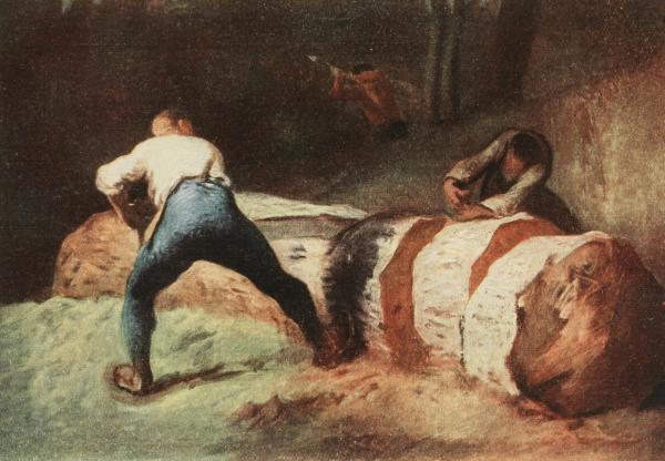 The wonderful capacity of Millet for portraying action is demonstrated to the full in this canvas. Hard, unremitting toil is the theme Millet has wished to bring before us. The heat is intense, but the work goes on with unrelaxing vigour. The masculine energy of the two bending figures are in striking contrast with the figure of the young girl on the left of the picture. The artist shows that he was quite capable of infusing charm into his peasant studies as well as bringing the brutalising aspect of their labour before the spectator.