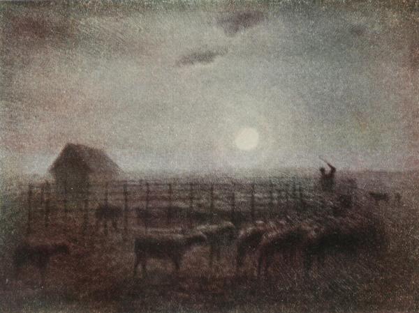 The poetry of moonlight has never been better realised than by Millet. The lonely watch of the shepherd, the huddling together of the sheep, the dreary mystical plain stretching away to the horizon, losing itself finally in the vaporous atmosphere of the chilly night, are all rendered with astonishing fidelity. It is in such works as these that the master reveals his sympathy with the solitude of many phases of peasant life.