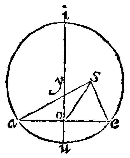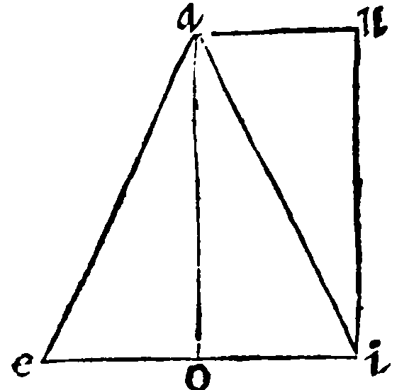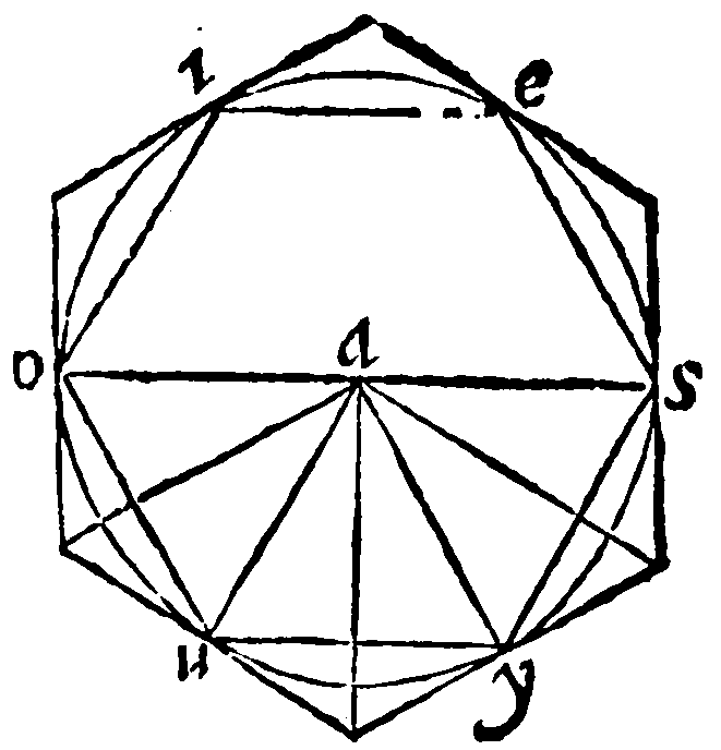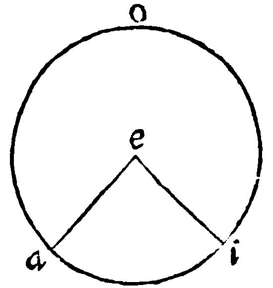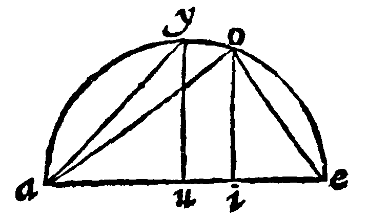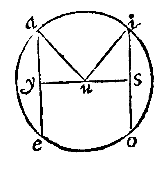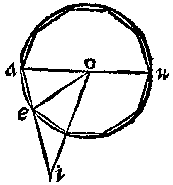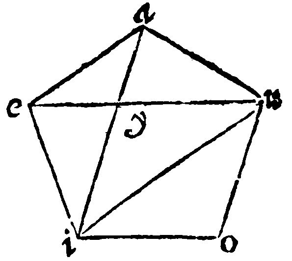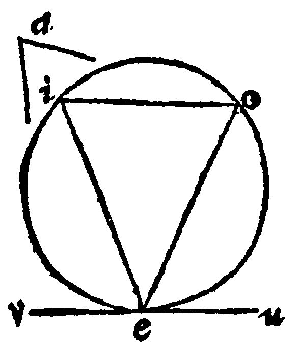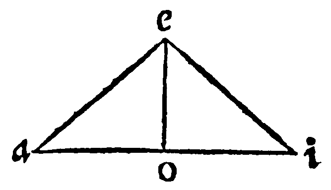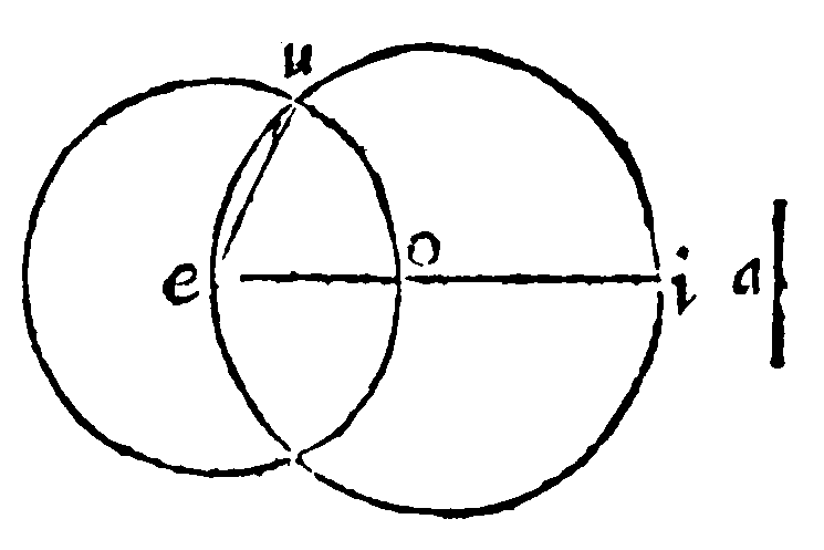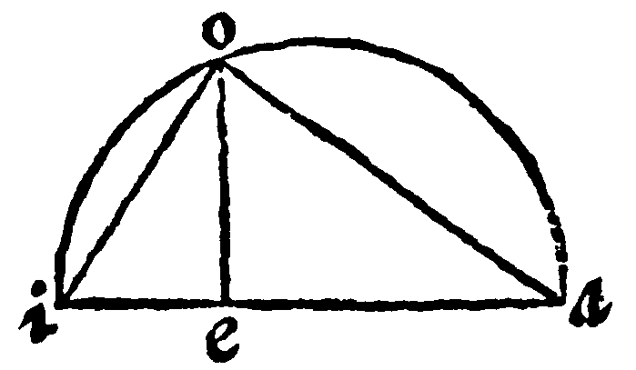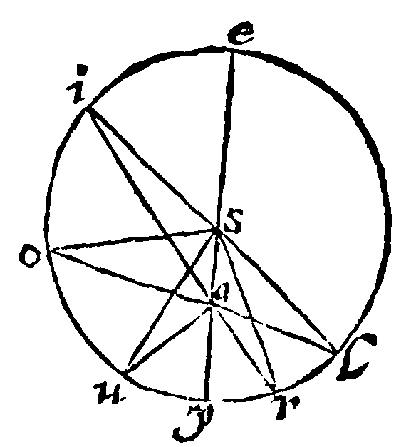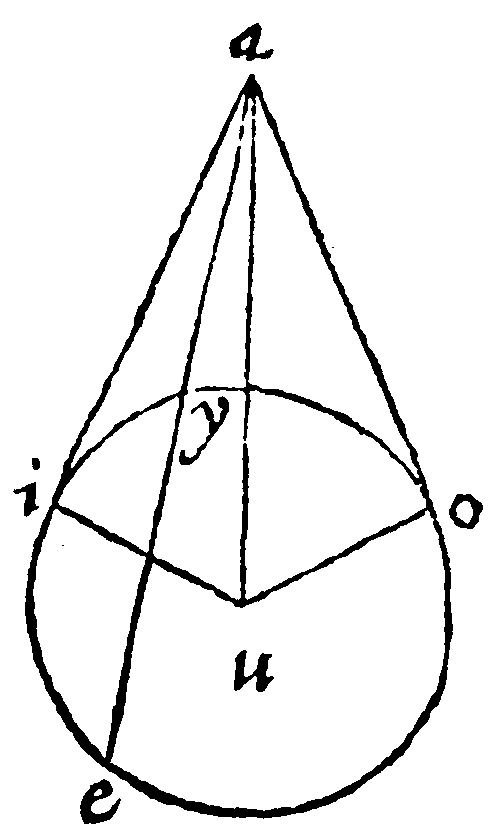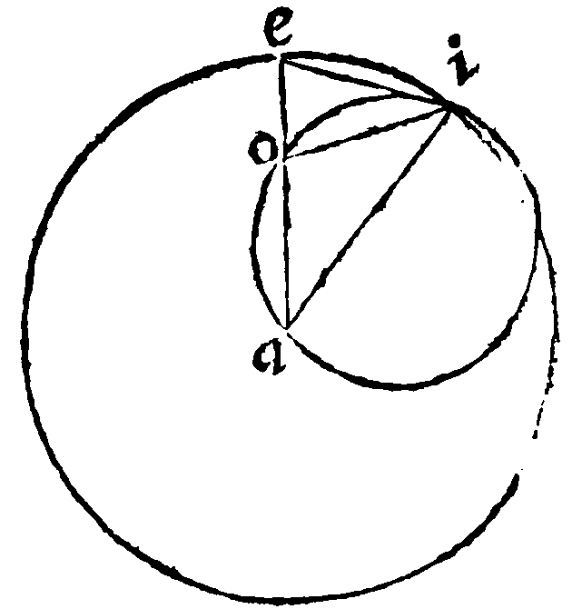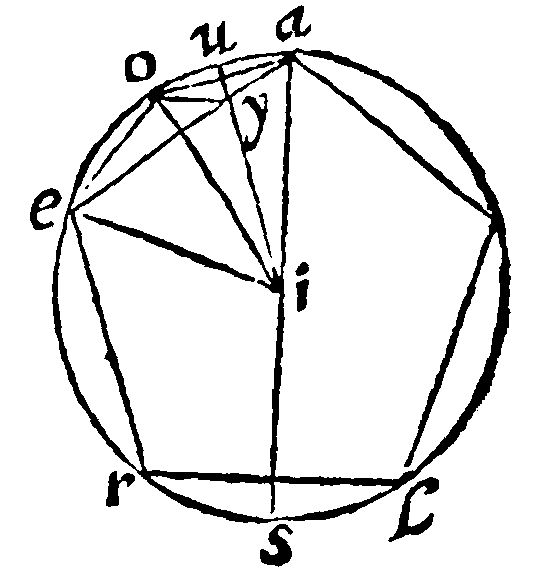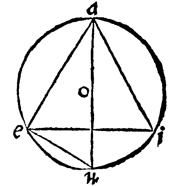 As it will plainely appeare, if all of them be gathered into one, thus. For ai, the side of the Tetrahedrum, subtendeth a greater periphery than ao, the side of the Octahedrum; And ao, a greater than ie, the side of the Cube; because it subtendeth but the halfe: And ie, greater than ue, the side of the Icosahedrum: And ue, greater than ye, the side of Dodecahedrum.