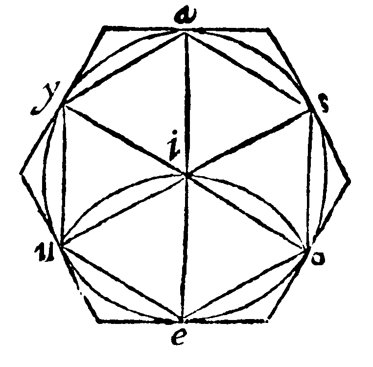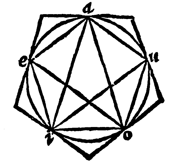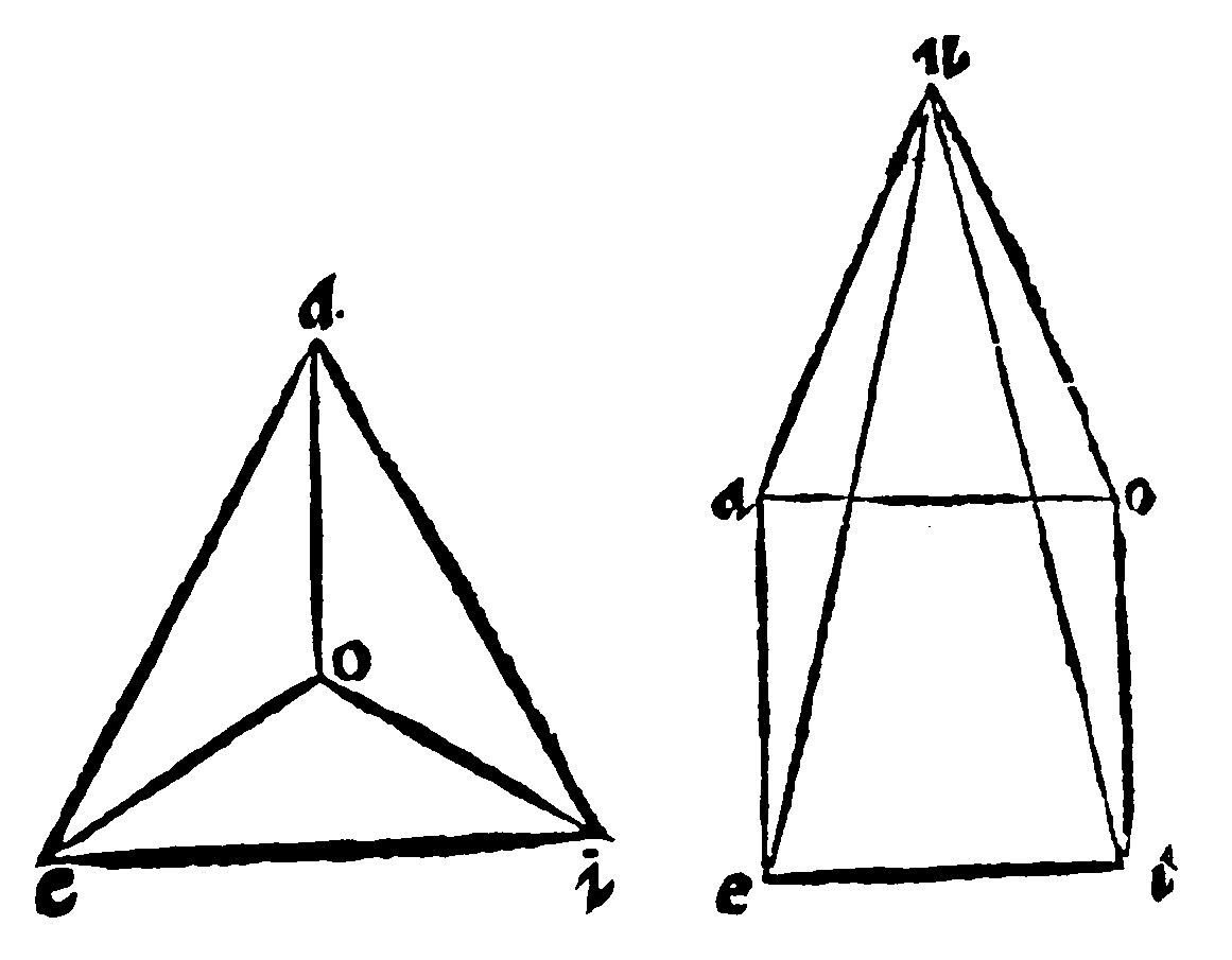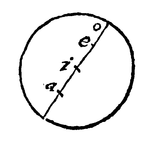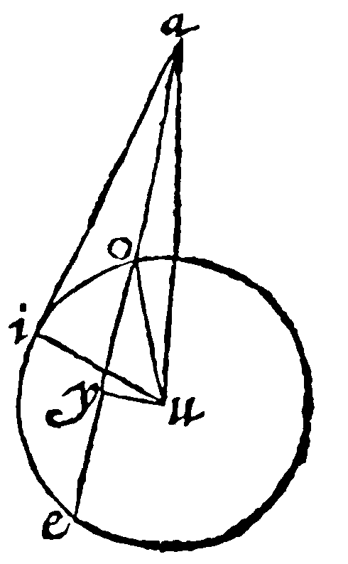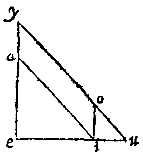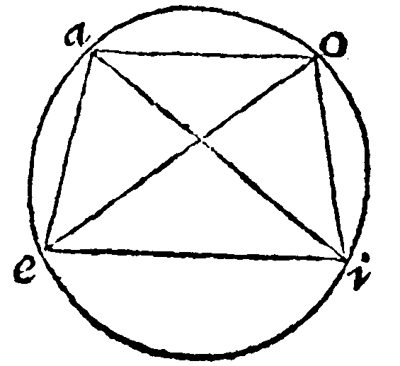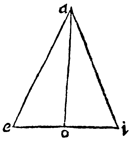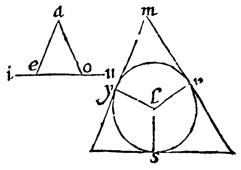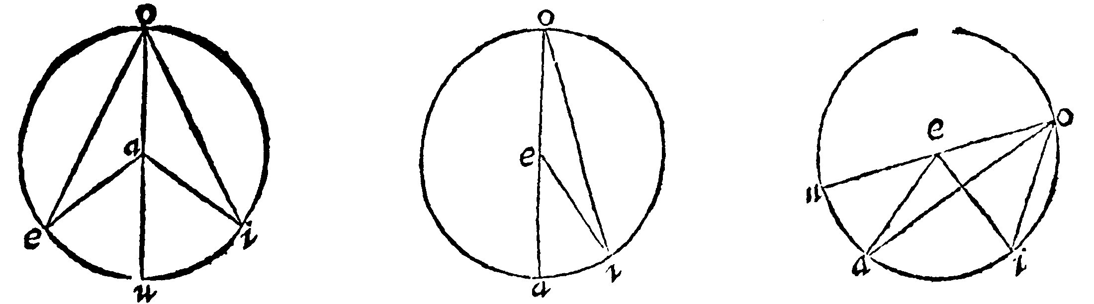 As it will plainely appeare, if all of them be gathered into one, thus. For ai, the side of the Tetrahedrum, subtendeth a greater periphery than ao, the side of the Octahedrum; And ao, a greater than ie, the side of the Cube; because it subtendeth but the halfe: And ie, greater than ue, the side of the Icosahedrum: And ue, greater than ye, the side of Dodecahedrum.
