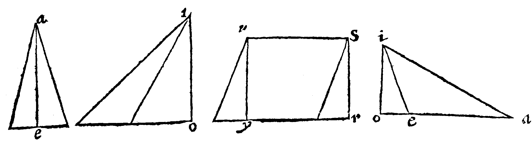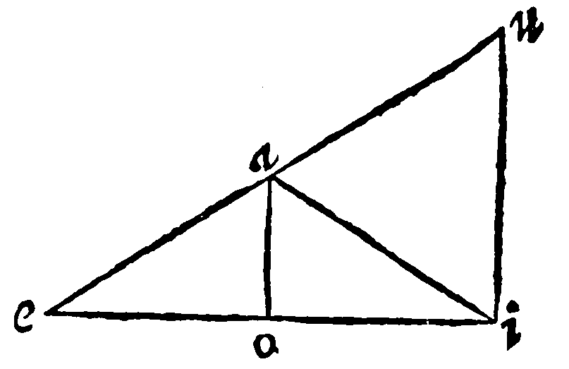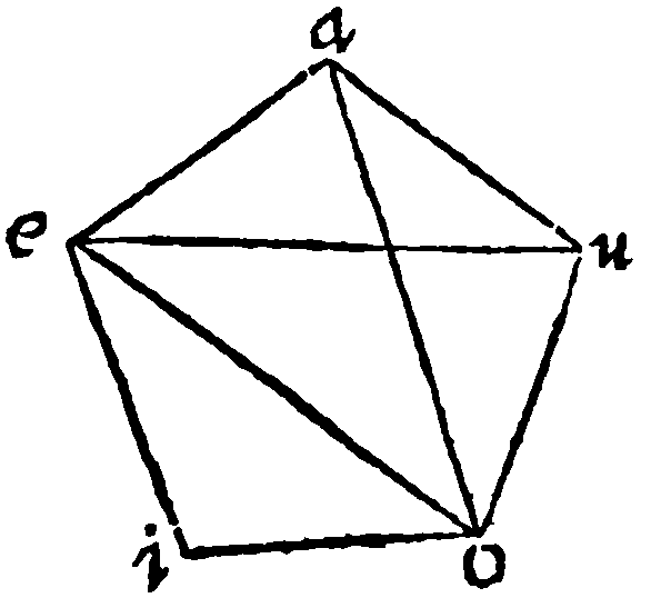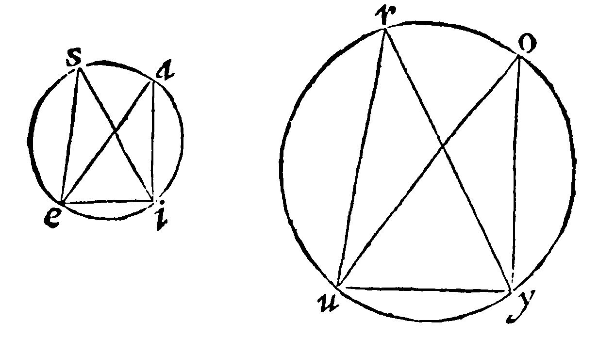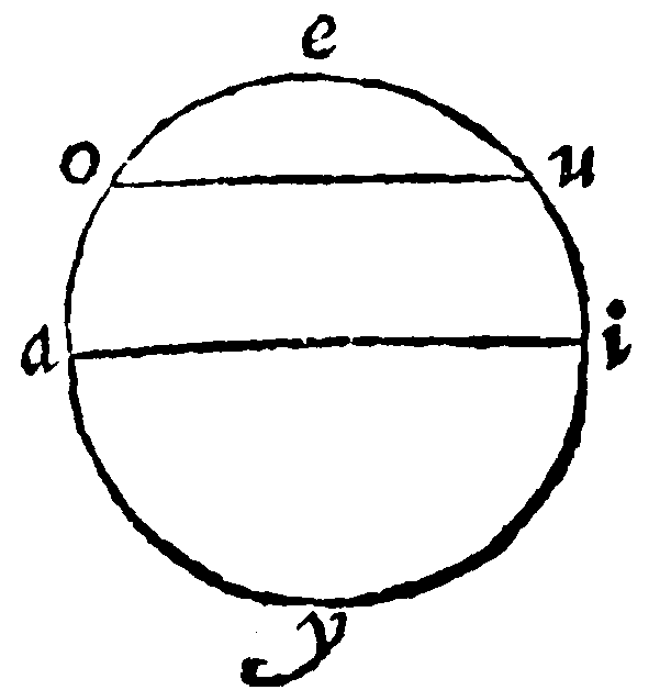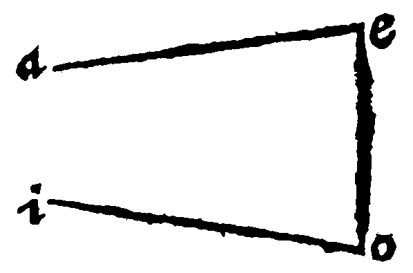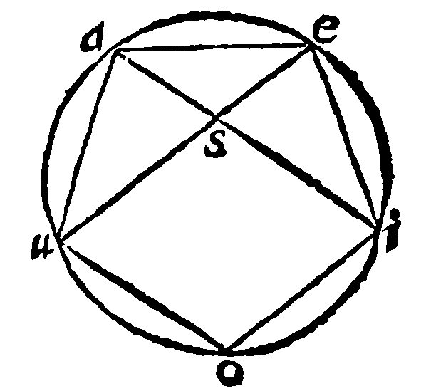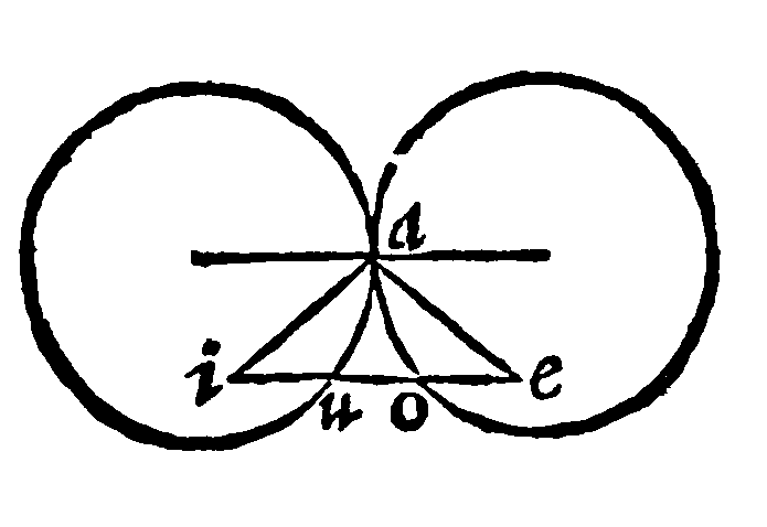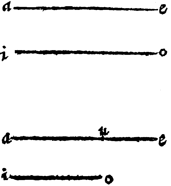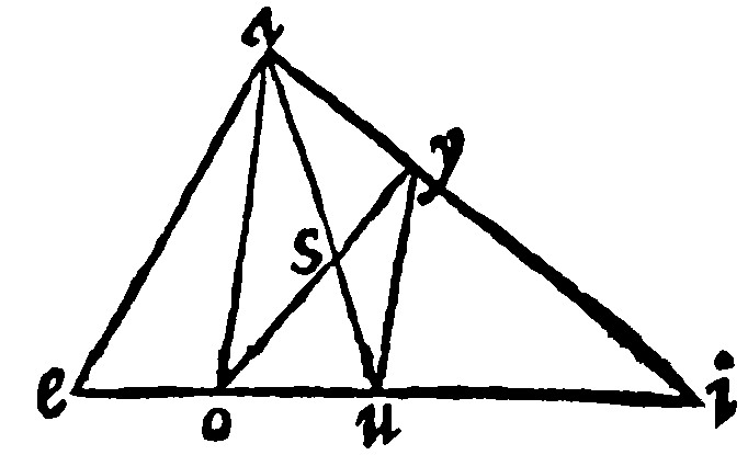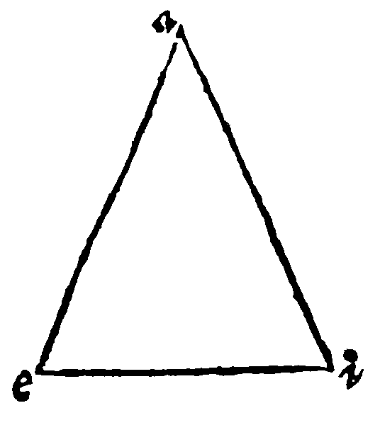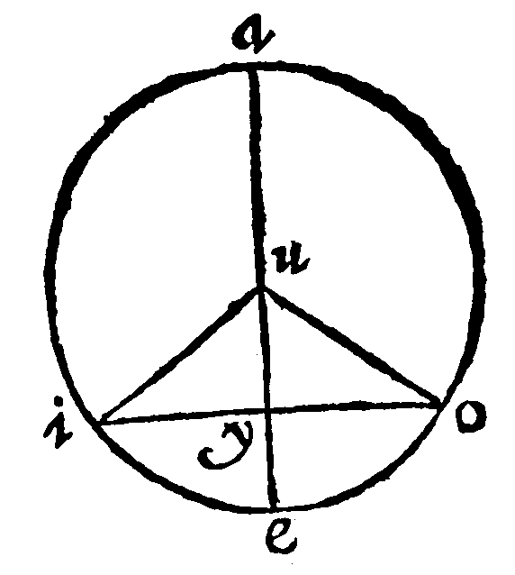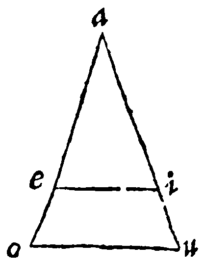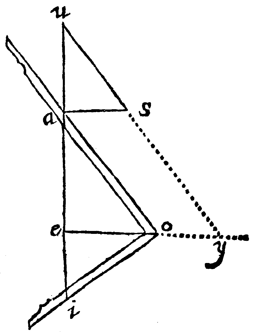 As it will plainely appeare, if all of them be gathered into one, thus. For ai, the side of the Tetrahedrum, subtendeth a greater periphery than ao, the side of the Octahedrum; And ao, a greater than ie, the side of the Cube; because it subtendeth but the halfe: And ie, greater than ue, the side of the Icosahedrum: And ue, greater than ye, the side of Dodecahedrum.