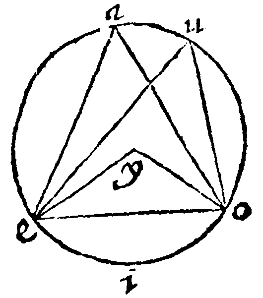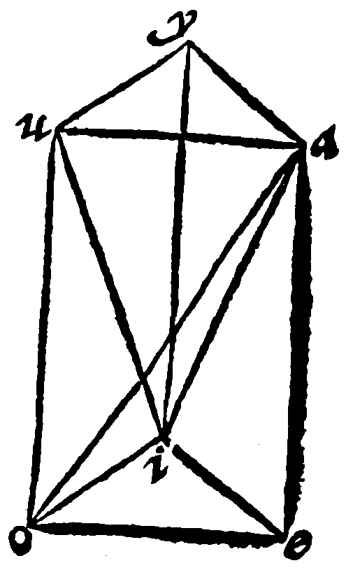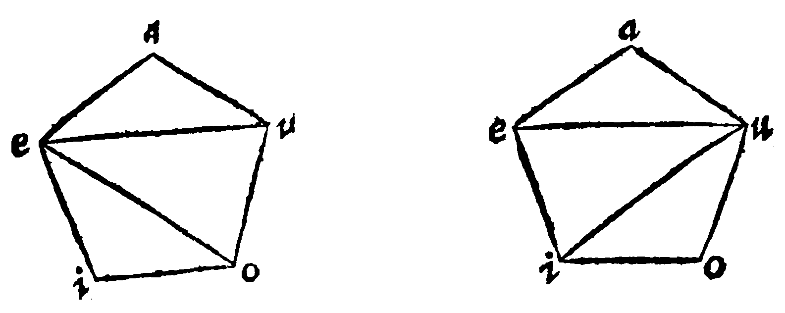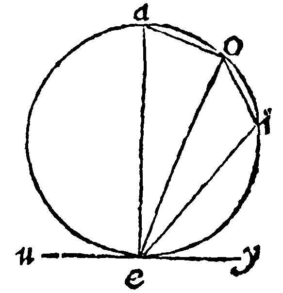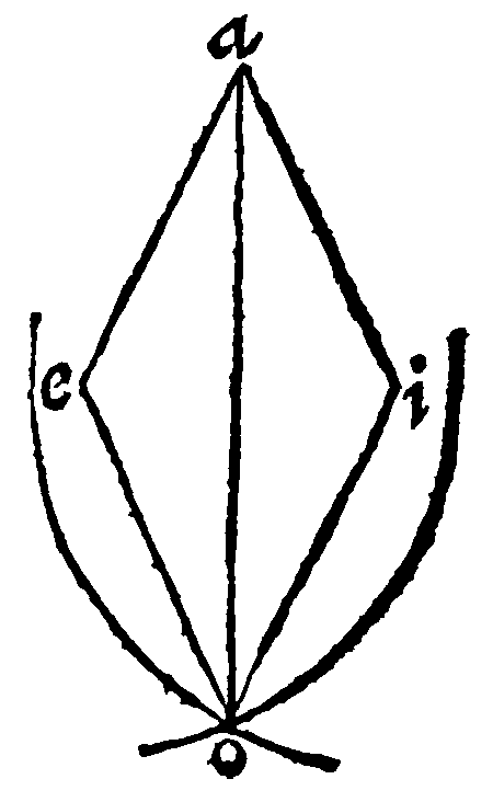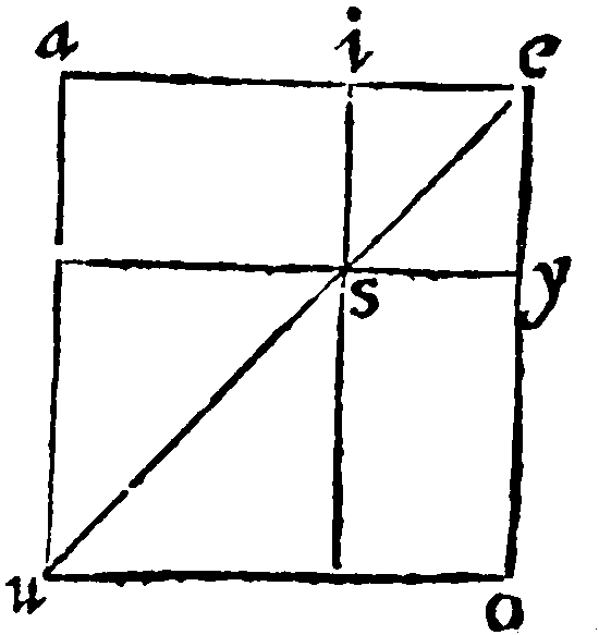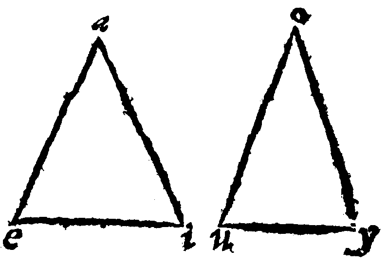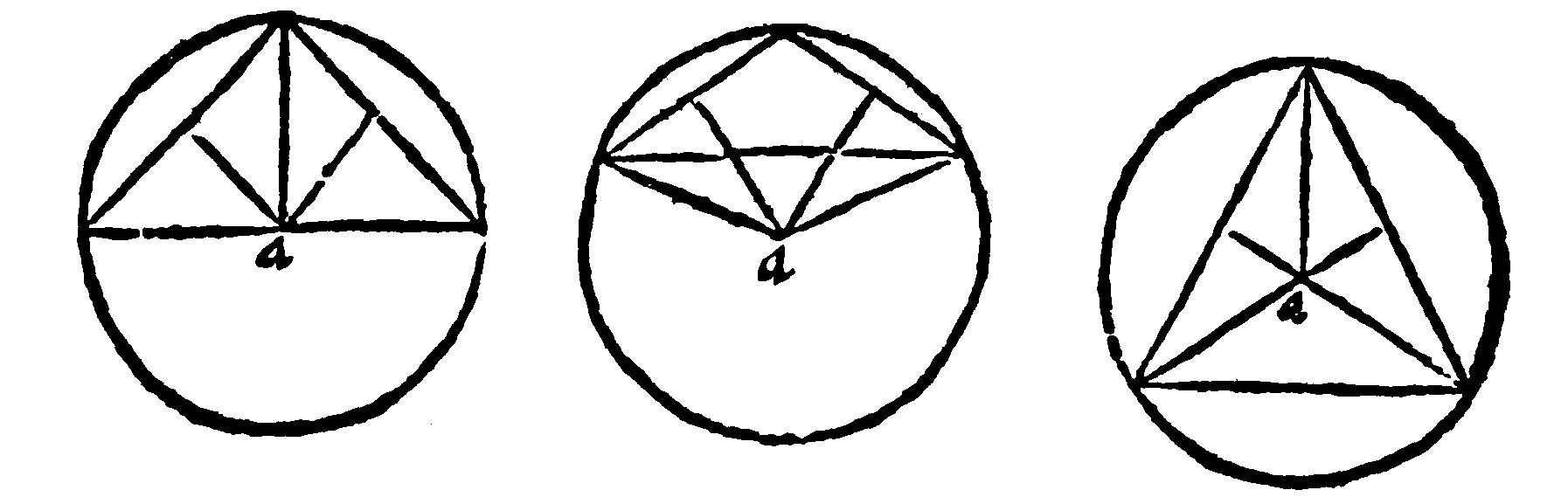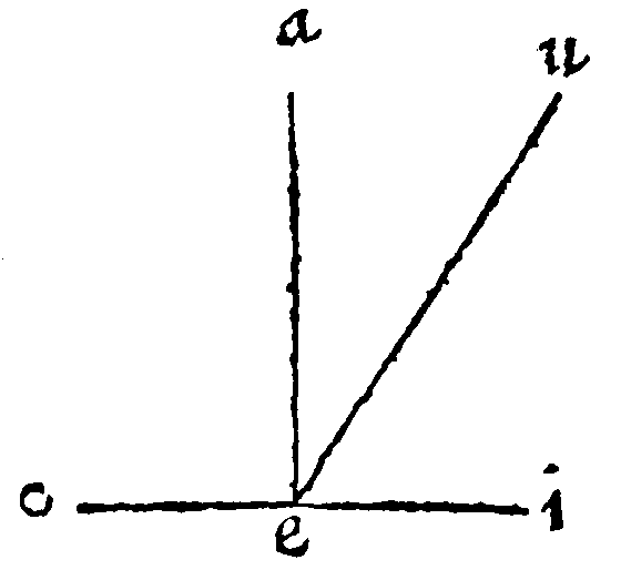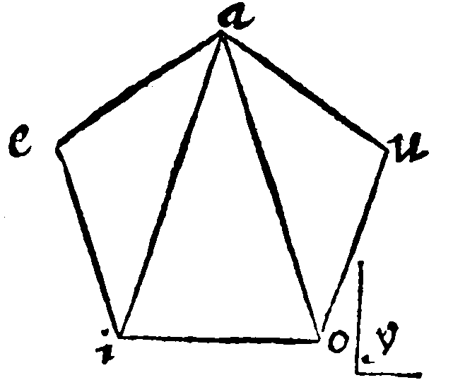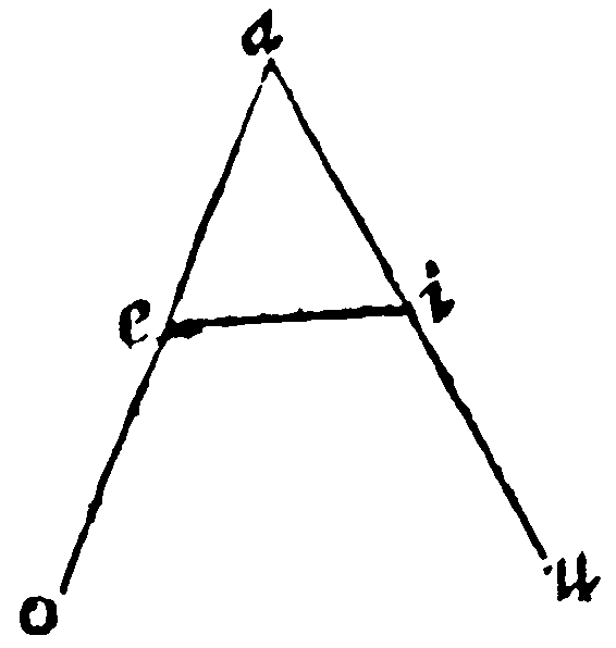 As it will plainely appeare, if all of them be gathered into one, thus. For ai, the side of the Tetrahedrum, subtendeth a greater periphery than ao, the side of the Octahedrum; And ao, a greater than ie, the side of the Cube; because it subtendeth but the halfe: And ie, greater than ue, the side of the Icosahedrum: And ue, greater than ye, the side of Dodecahedrum.