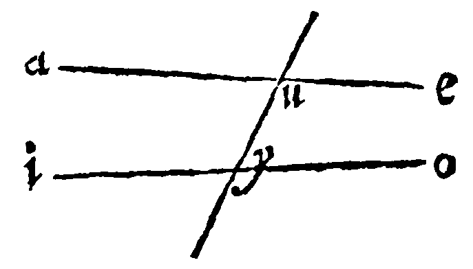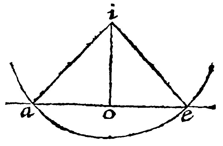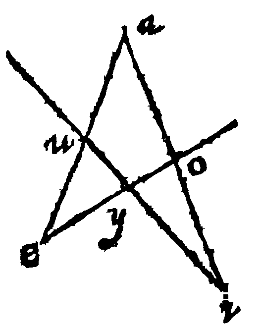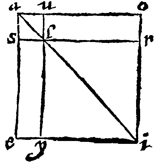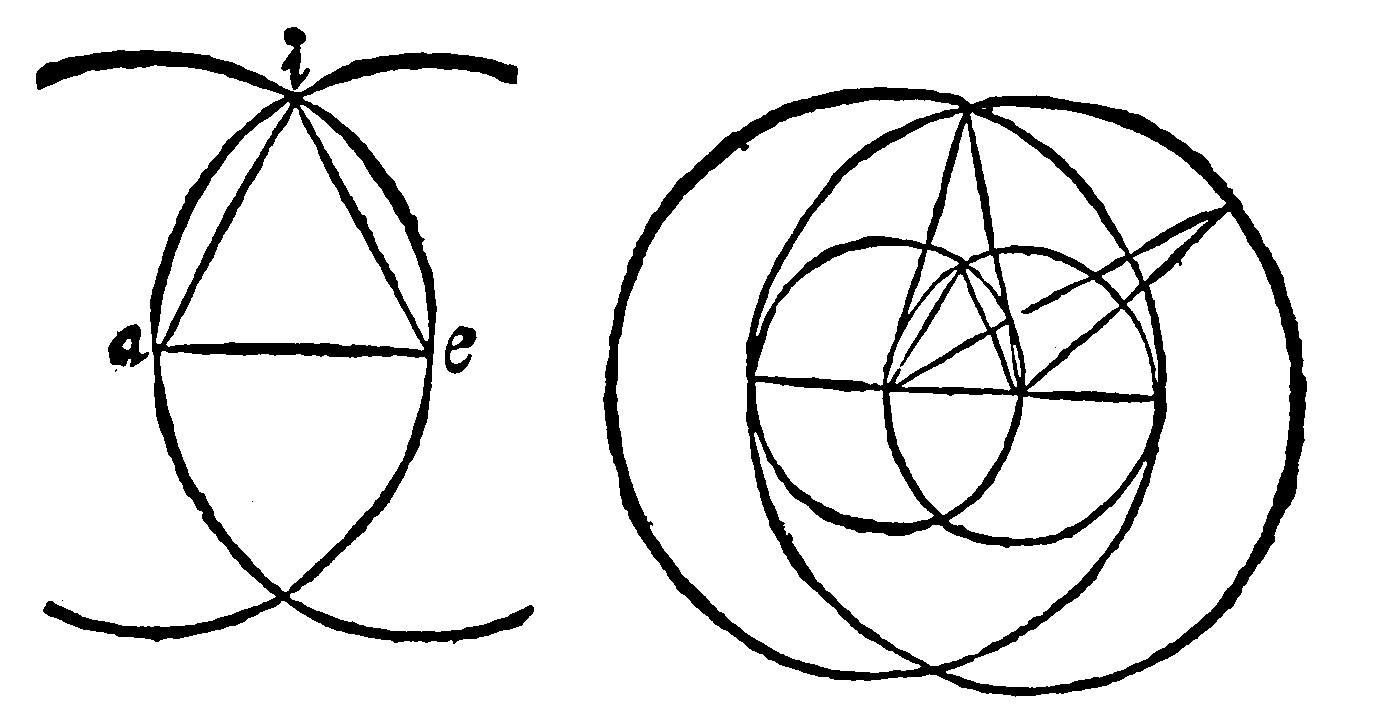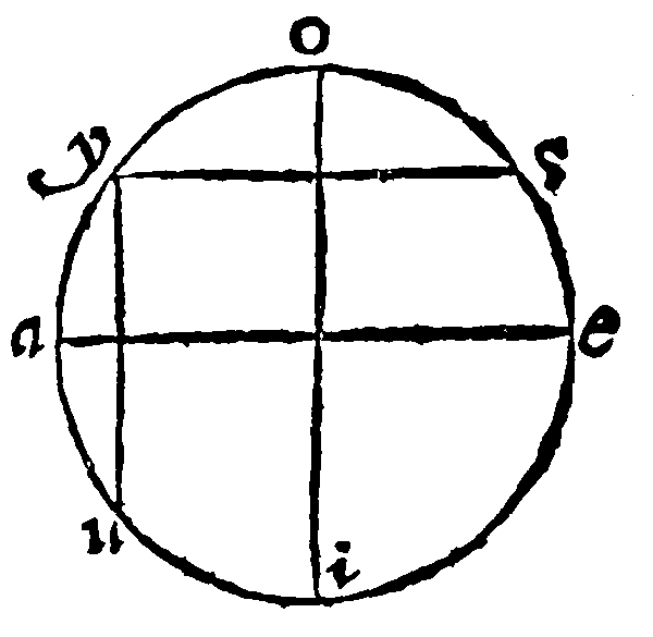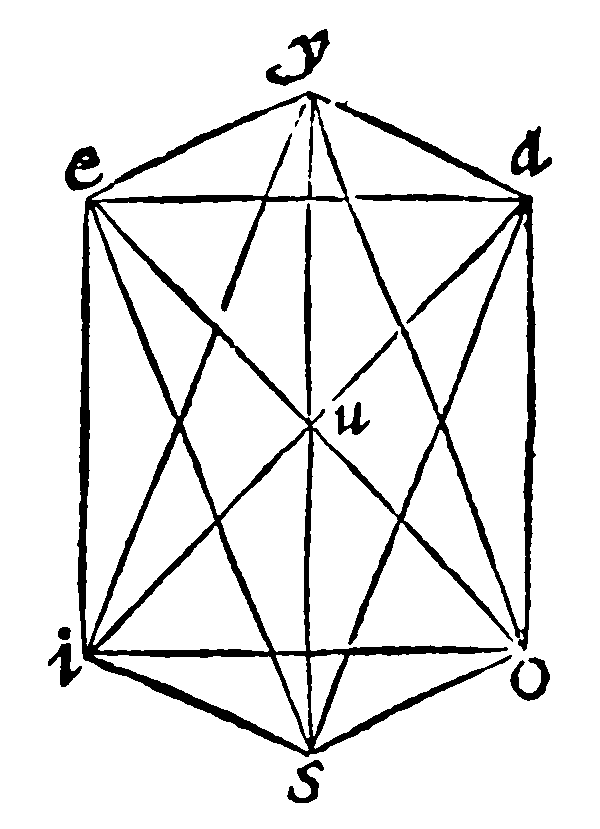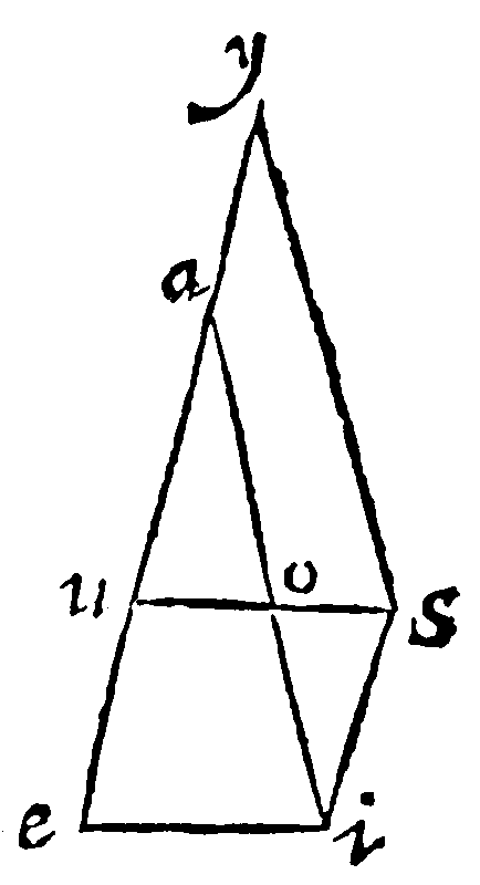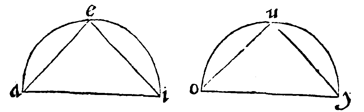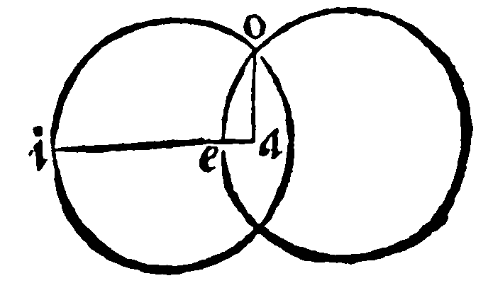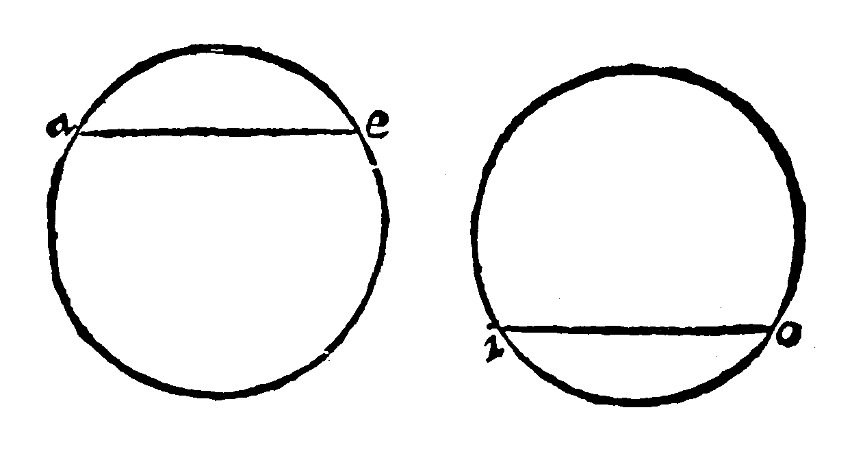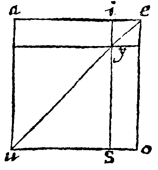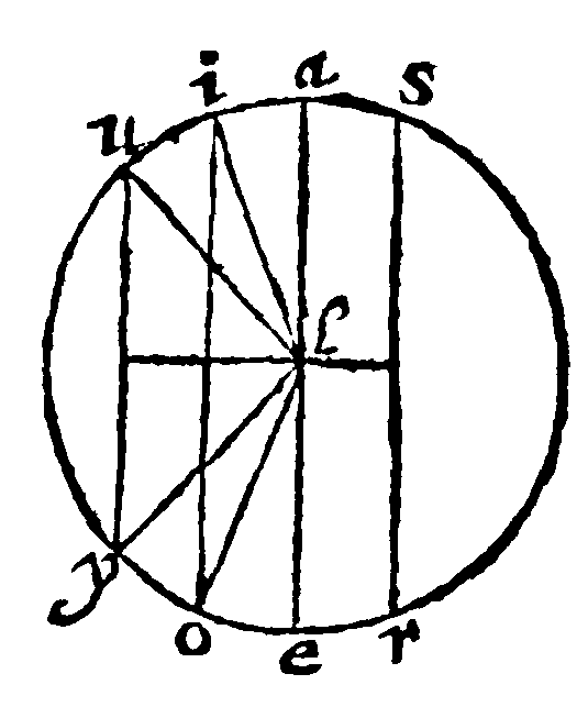As it will plainely appeare, if all of them be gathered into one, thus. For ai, the side of the Tetrahedrum, subtendeth a greater periphery than ao, the side of the Octahedrum; And ao, a greater than ie, the side of the Cube; because it subtendeth but the halfe: And ie, greater than ue, the side of the Icosahedrum: And ue, greater than ye, the side of Dodecahedrum.