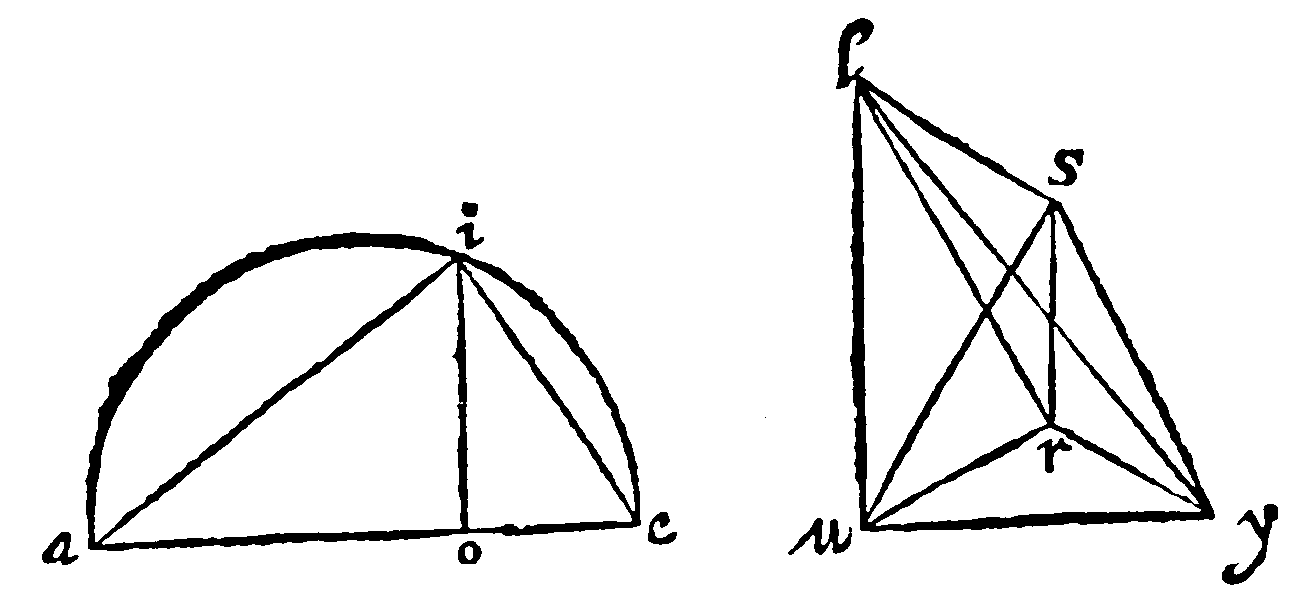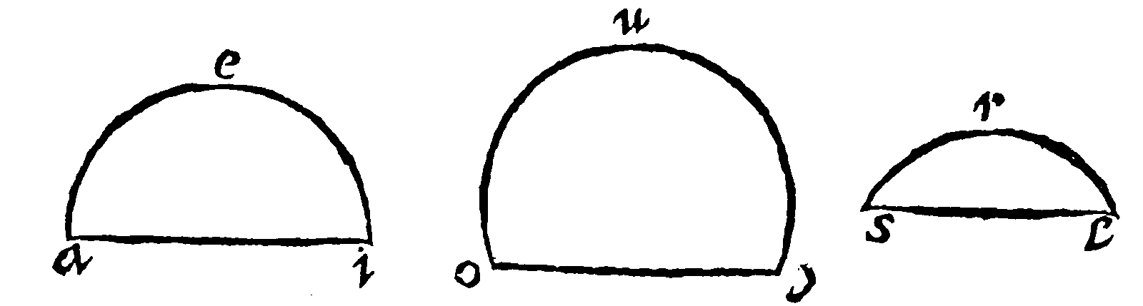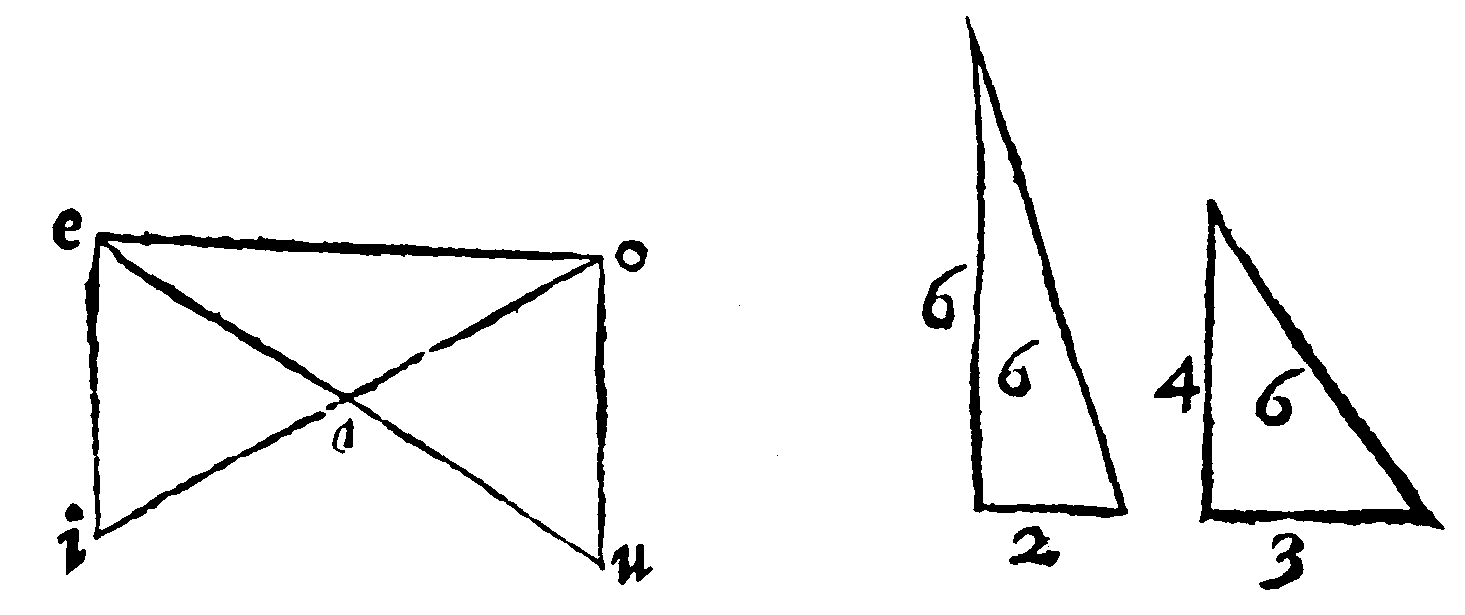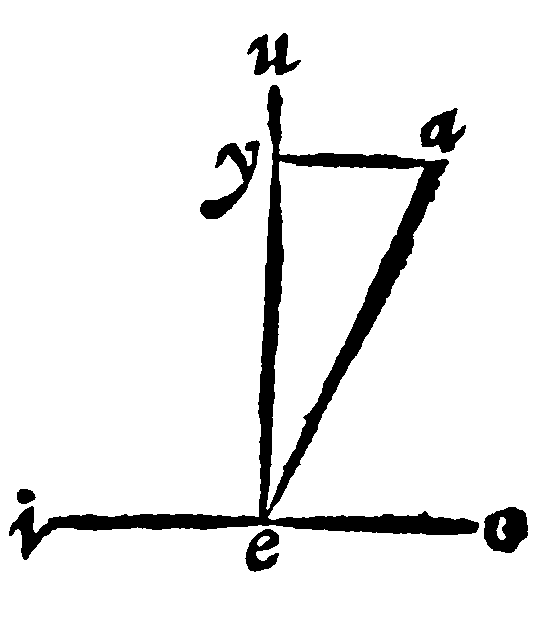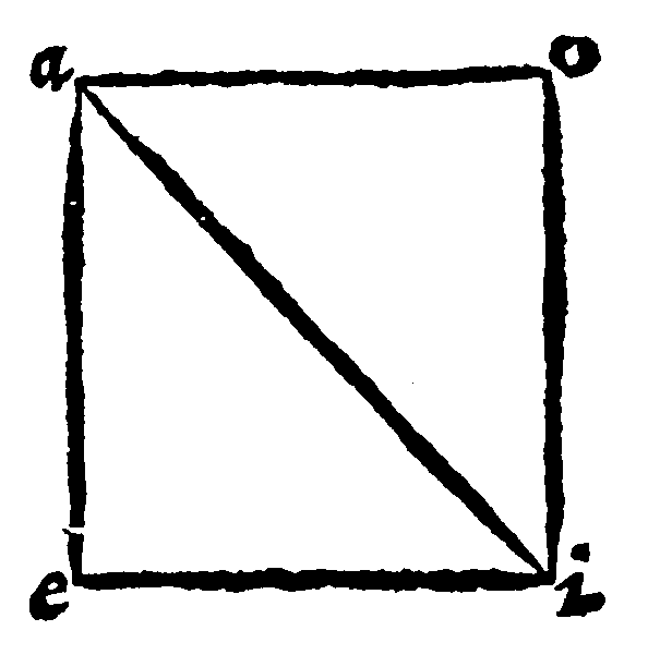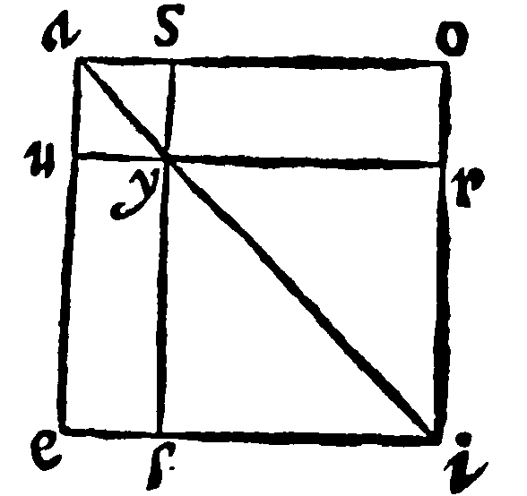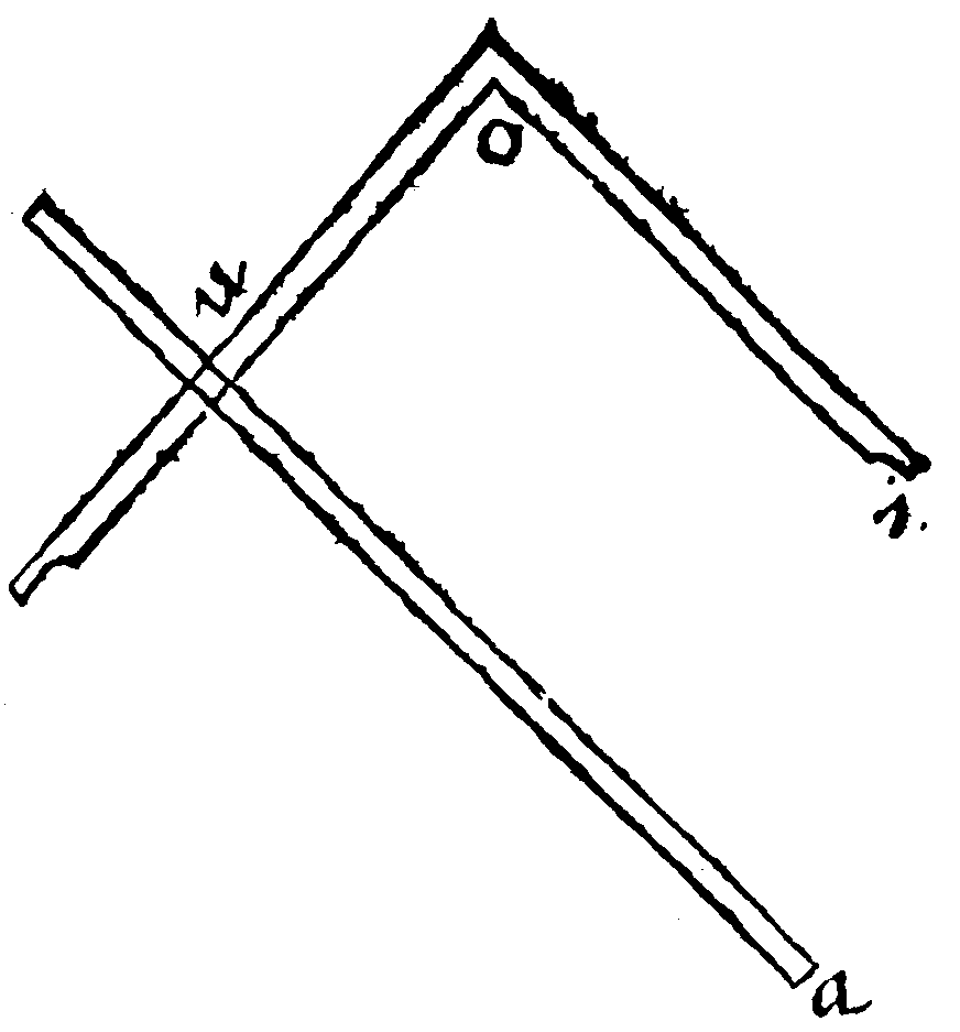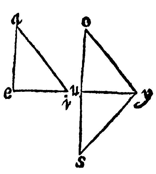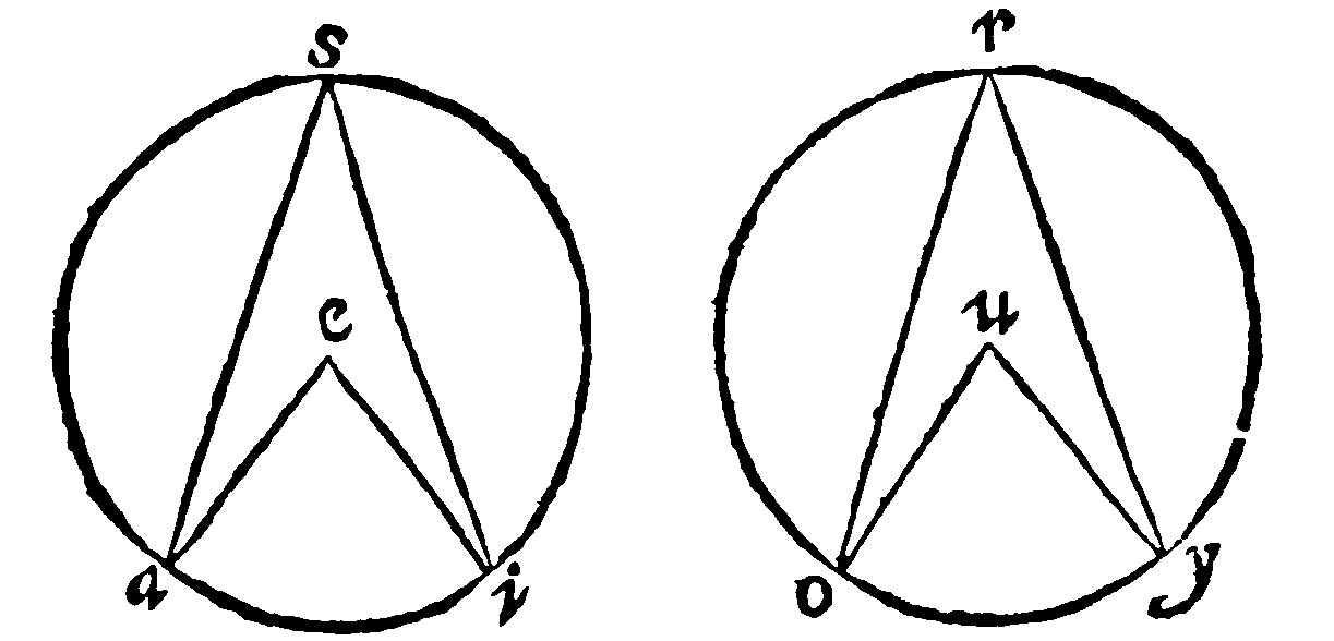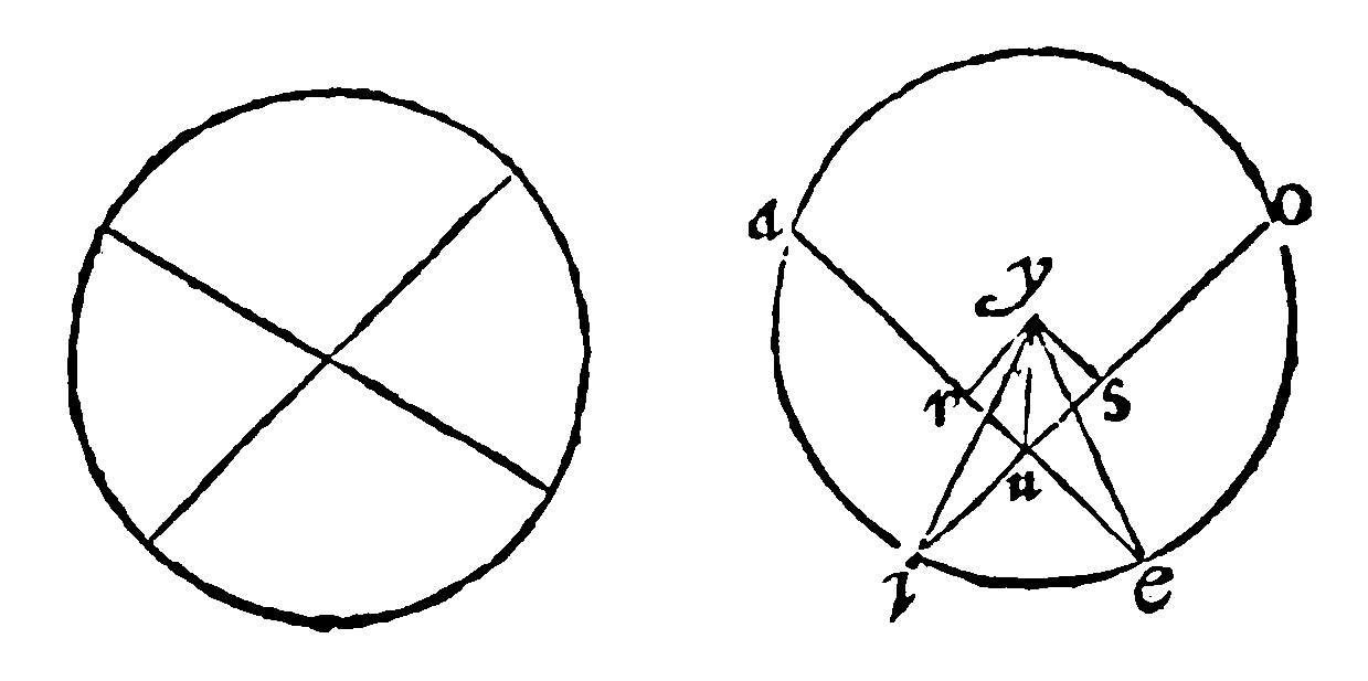 As it will plainely appeare, if all of them be gathered into one, thus. For ai, the side of the Tetrahedrum, subtendeth a greater periphery than ao, the side of the Octahedrum; And ao, a greater than ie, the side of the Cube; because it subtendeth but the halfe: And ie, greater than ue, the side of the Icosahedrum: And ue, greater than ye, the side of Dodecahedrum.