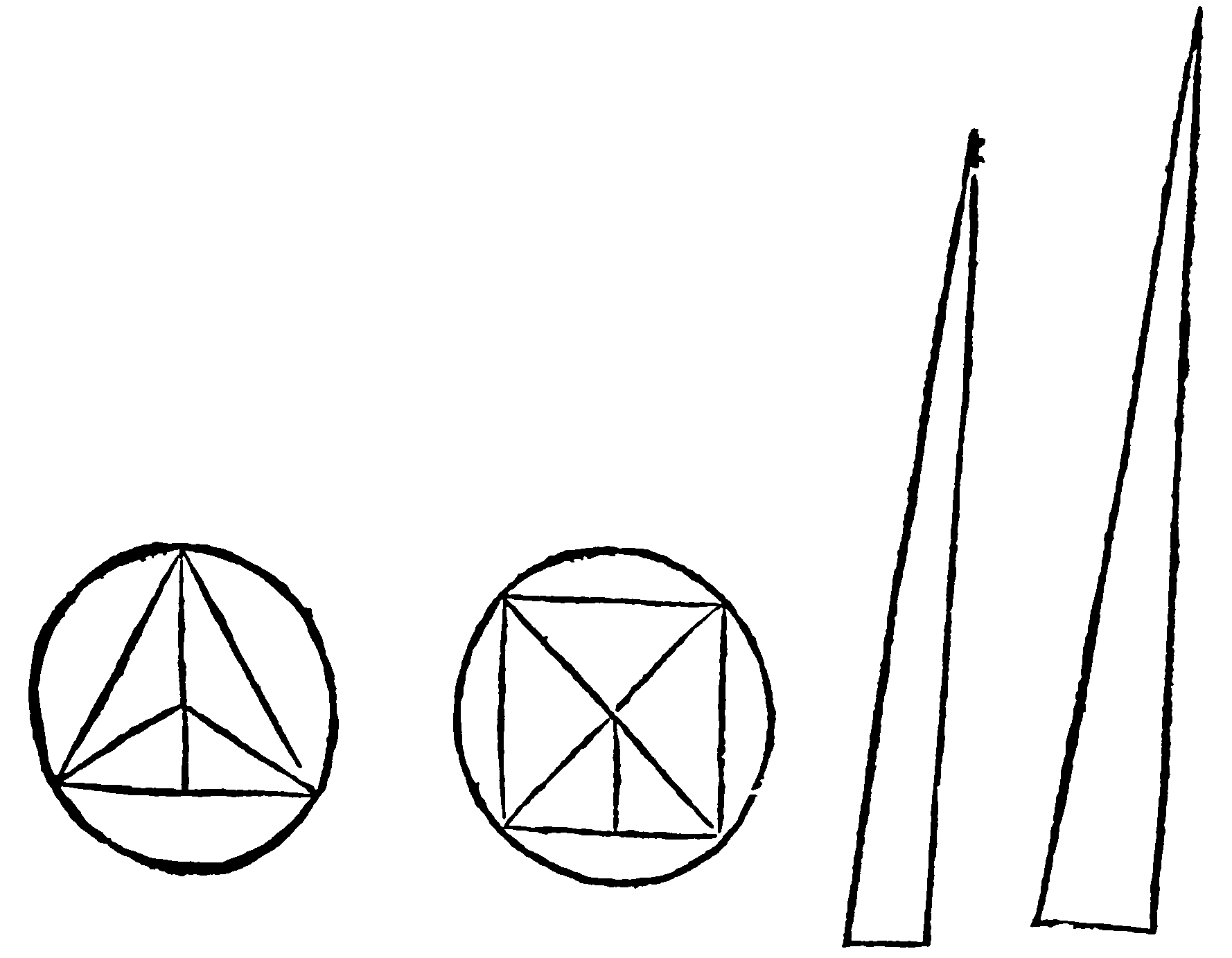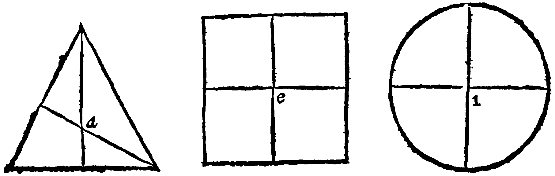 The Adscription of ordinate plaine bodies is unto a spheare, as before the Adscription plaine surfaces was into a circle; of a triangle, I meane, and ordinate triangulate, as Quadrangle, Quinquangle, Sexangle, Decangle, and Quindecangle. But indeed the Geometer hath both inscribed and circumscribed those plaine figures within a circle. But these five ordinate bodies, and over and above the Polyhedrum the Stereometer hath onely inscribed within the spheare. The Polyhedrum we have passed over, and we purpose onely to touch the other ordinate bodies.