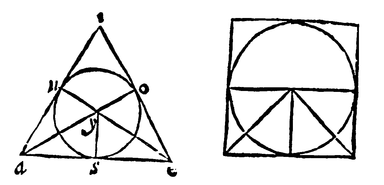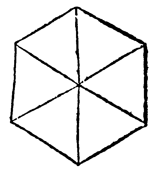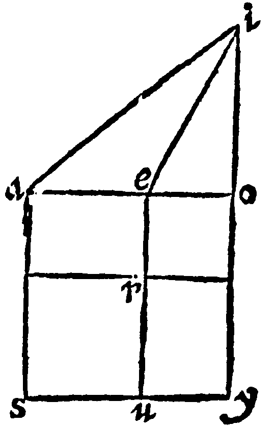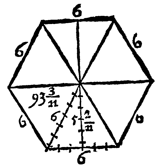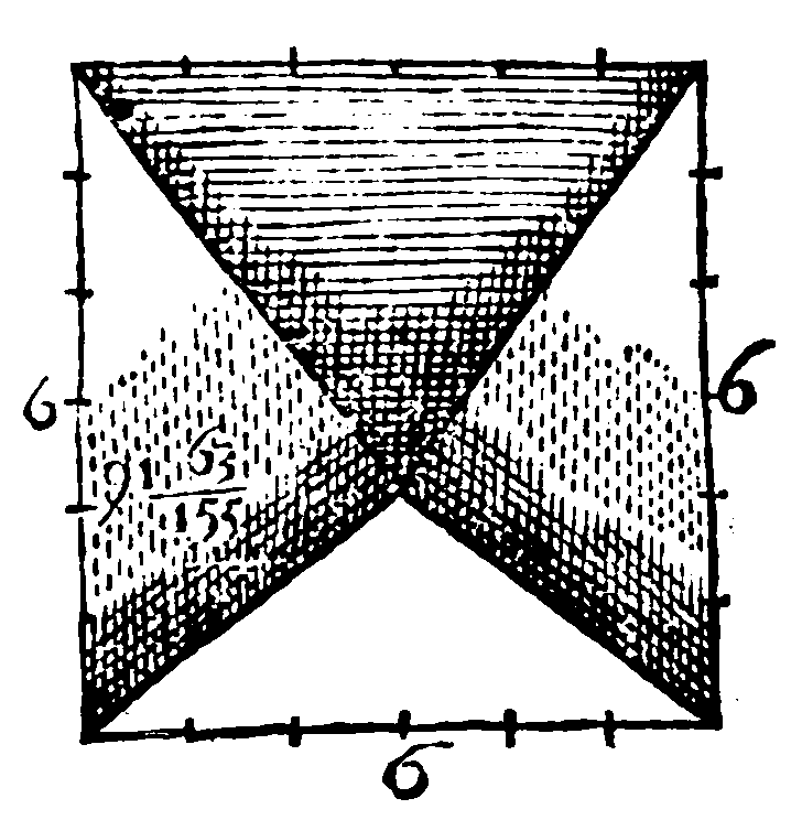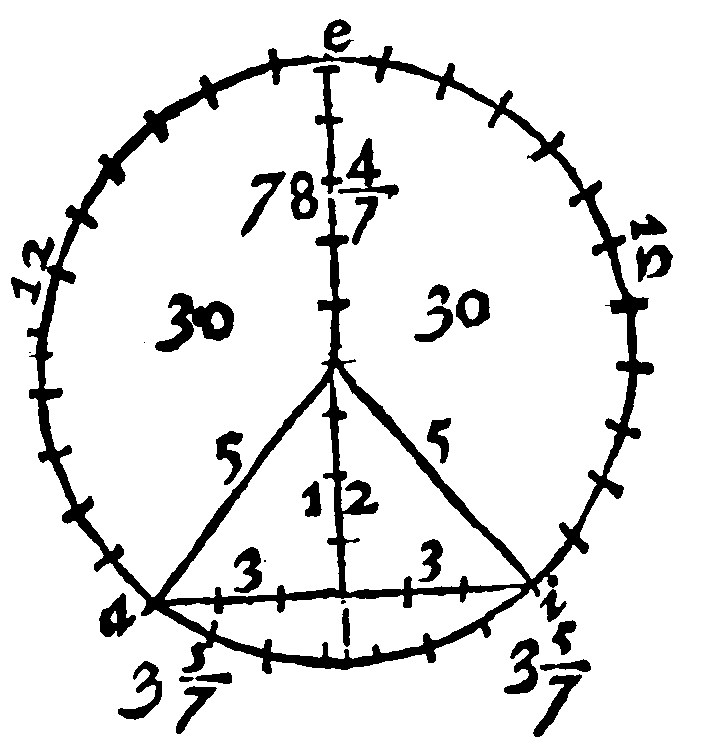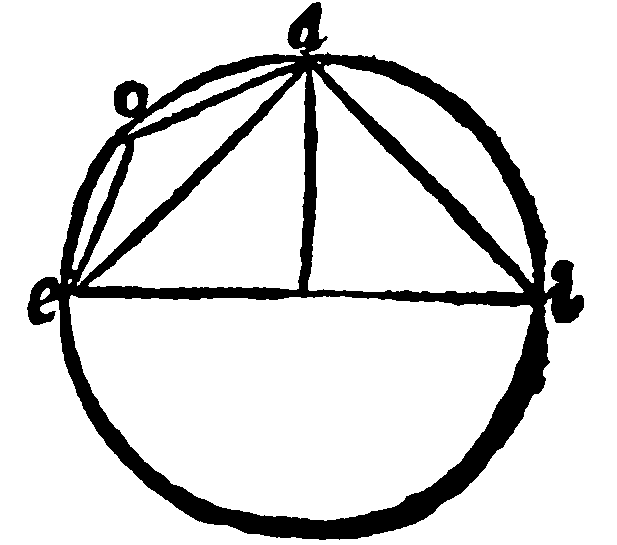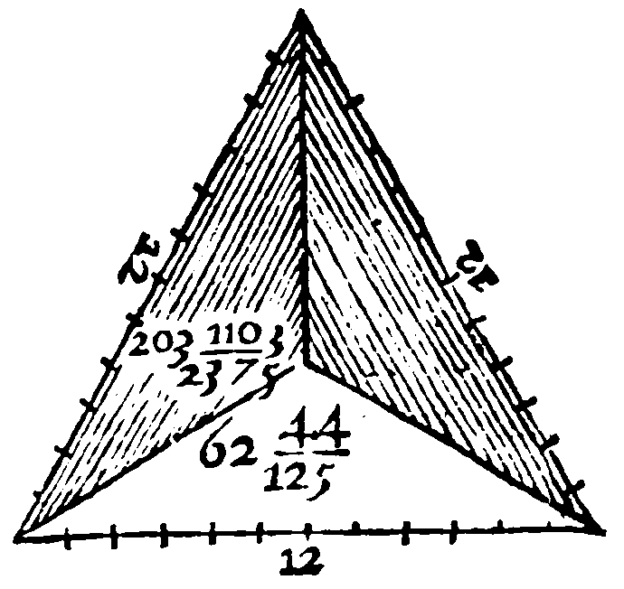 And from hence also shall be the geodesy of the Icosaedrum. For the finding out of the heighth of the pyramis, there is the semidiagony of the side of the decangle and the halfe ray of the circle: But the side of the decangle is a right line subtending the halfe periphery of the side of the quinquangle, or else the greater segment of the ray [278]proportionally cut. For so it may be taken Geometrically, and reckoned for his measure. Therefore if the quadrate of the side of the decangle, be taken out of the quadrate of the side of the quinquangle, there shall by the 15 e xviij, remaine the quadrate of the sexangle, that is of the ray. The side of the decangle (because the side of the quinquangle here is 6) shall be 3.3/35 to wit a right line subtending the halfe periphery. Now the halfe ray shall thus be had. The quadrates of the quinquangle and decangle are 36, and 9.639/1225. And this being subducted fro that, the remaine 26.386/1225 by the 15 e xviij, shall be the quadrate or square of the sexangle: And the side of it, 5, and almost 5/7 shall be the ray: The halfe ray therefore shall be 2.6/7. To the side of the decangle 3.3/35 adde 2.6/7: the whole shal be 5.33/35 for the semi-diagony of the Icosaedrum. The ray of the circle circumscribed about the triangle, is by the 12 e xviij, the same which was before 3.3/7 to wit of the quadrate 12. Therefore if the quadrate of the circular ray, be taken out of the quadrate of the halfe diagony, there shall remaine the quadrate of the heighth and perpendicular: the quadrate of the halfe-diagony is 35.389/1225: the quadrate of the circular ray is 12. This taken out of that beneath 23.639/1225: whose side is almost 5, for the perpendicular and heighth proposed: From whence now the Pyramis is esteemed. The case of a triangular pyramis is 15.18/31. The Plaine of this base and the third part of the heighth is 25.30/31 for the solidity of one Pyramis. This multiplyed by 20 maketh 519.11/31 for the summe or whole solidity of the Icosaedum. And this is the geodesy or manner of measuring of an Icosaedrum.