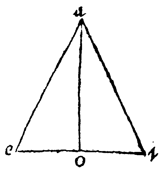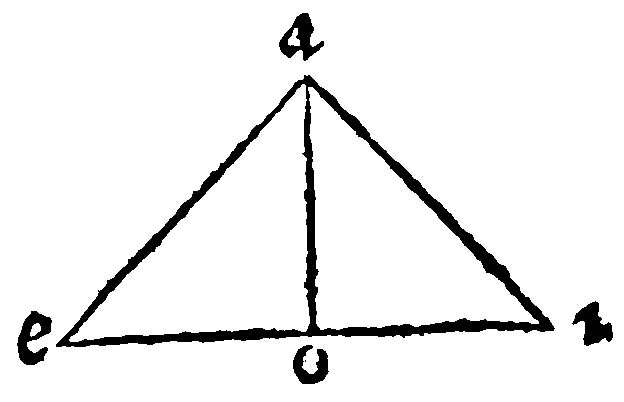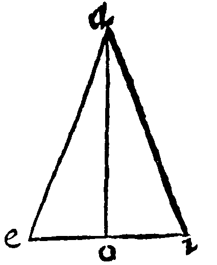 Here a threefold difference of the heighth of a Cone is professed, out of the threefold difference of the angles, whereby the toppe of the halfed cone is distinguished: Notwithstanding this consideration belongeth rather to the Optickes, than to Geometry. For a Cone a farre off seeme like triangle. Therefore according to the difference of the heighth, it [292]appeareth with a right angled, or obtusangled or acutangled toppe: As here the least Cone is obtusangled: the middle one rightangled: and the highest acutangled. But the cause of this threefold difference in the angles from of the difference of the shankes, is out of the consectaries of the threefold triangle of a right line cutting the base into two equall parts, as appeareth at the end of the viij Booke.