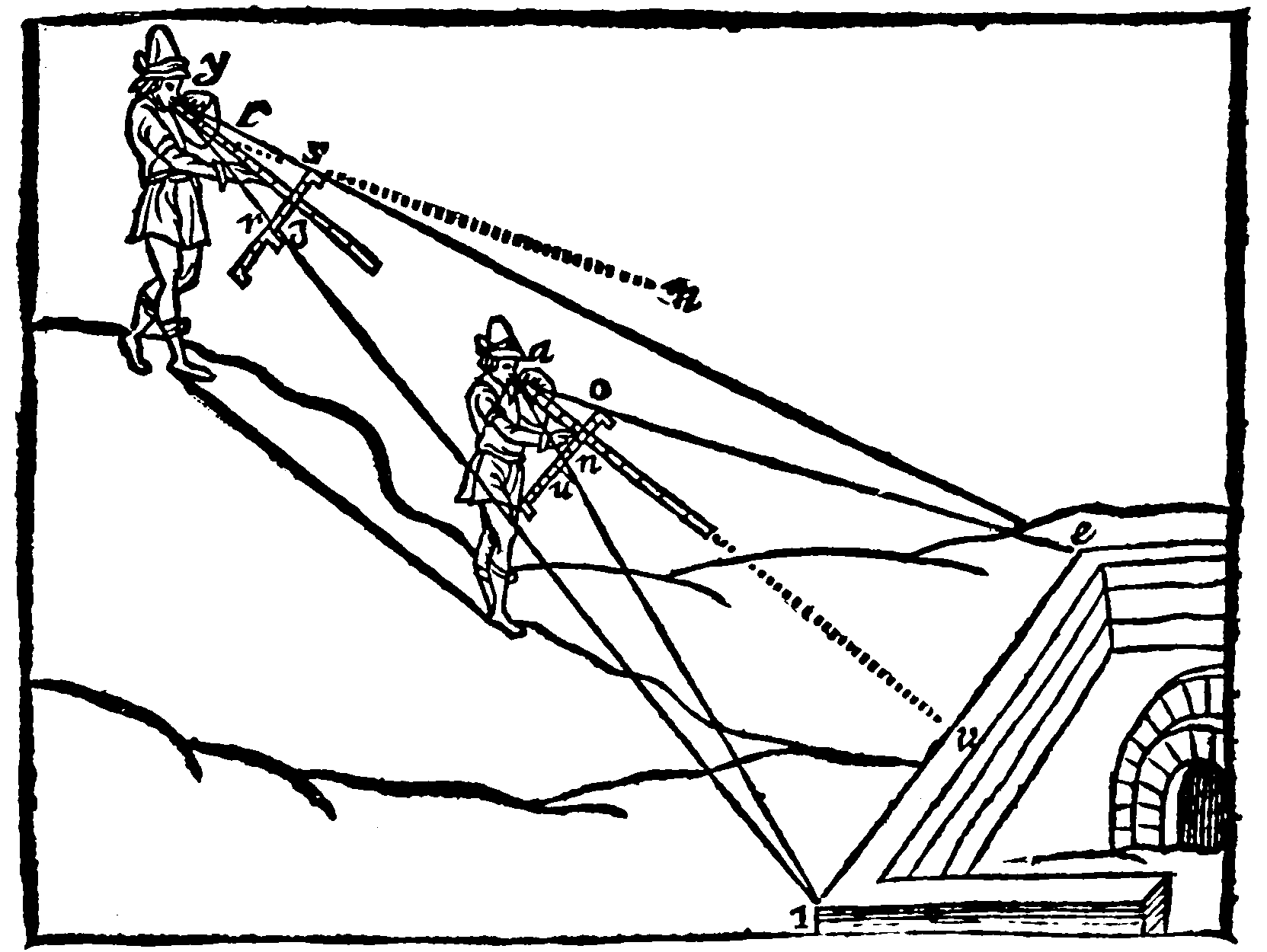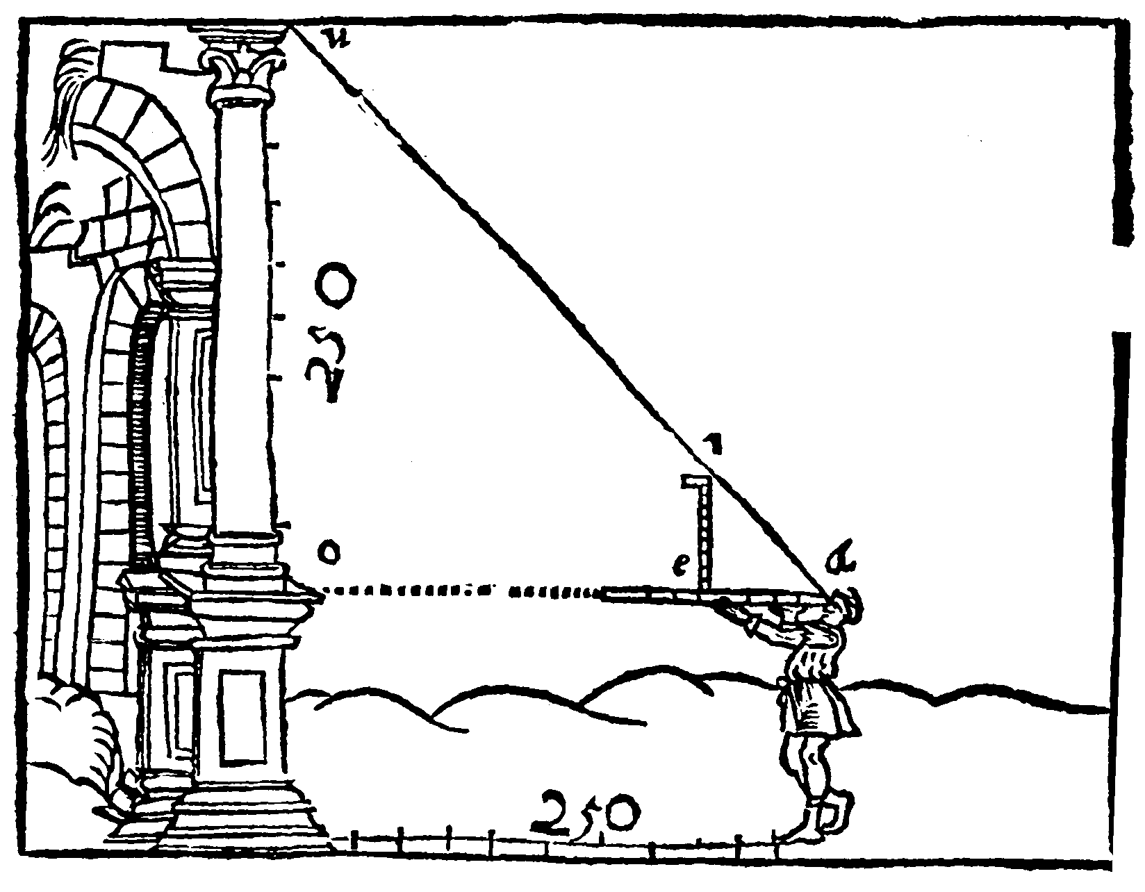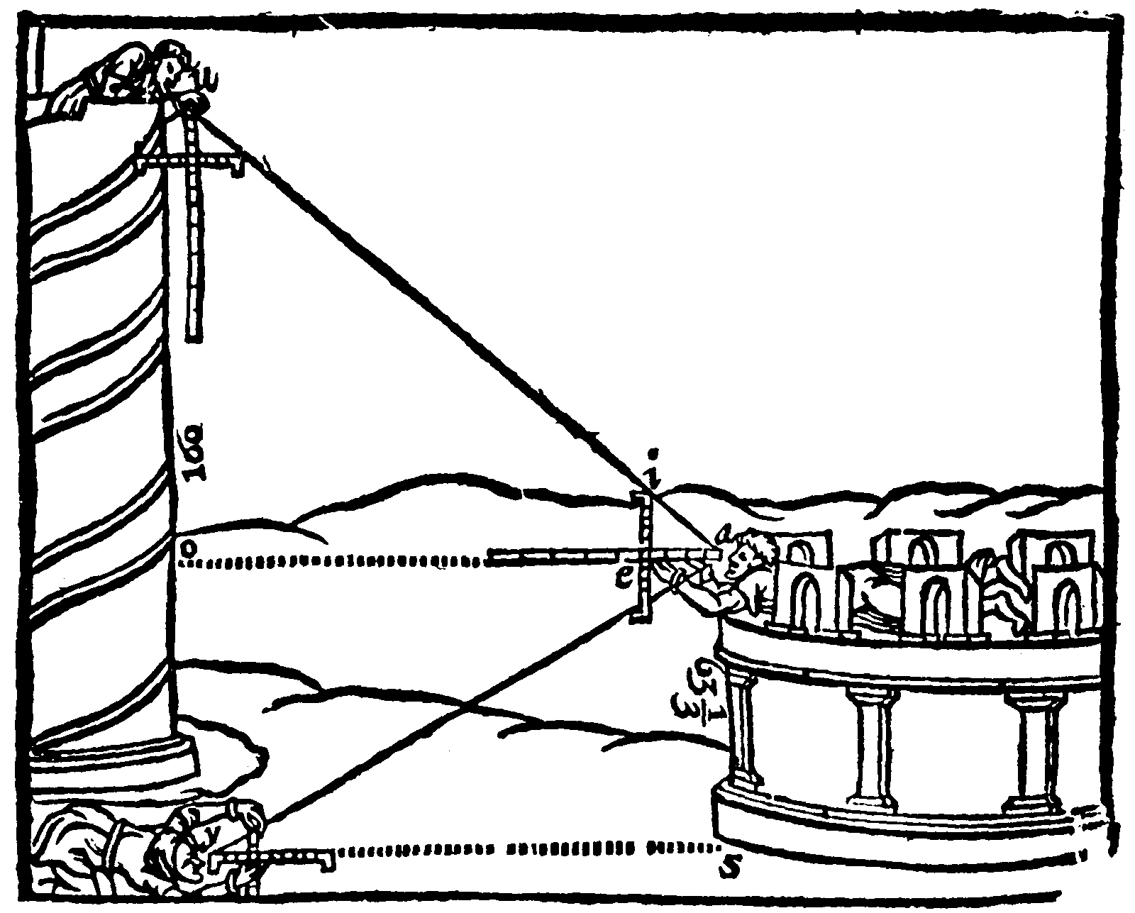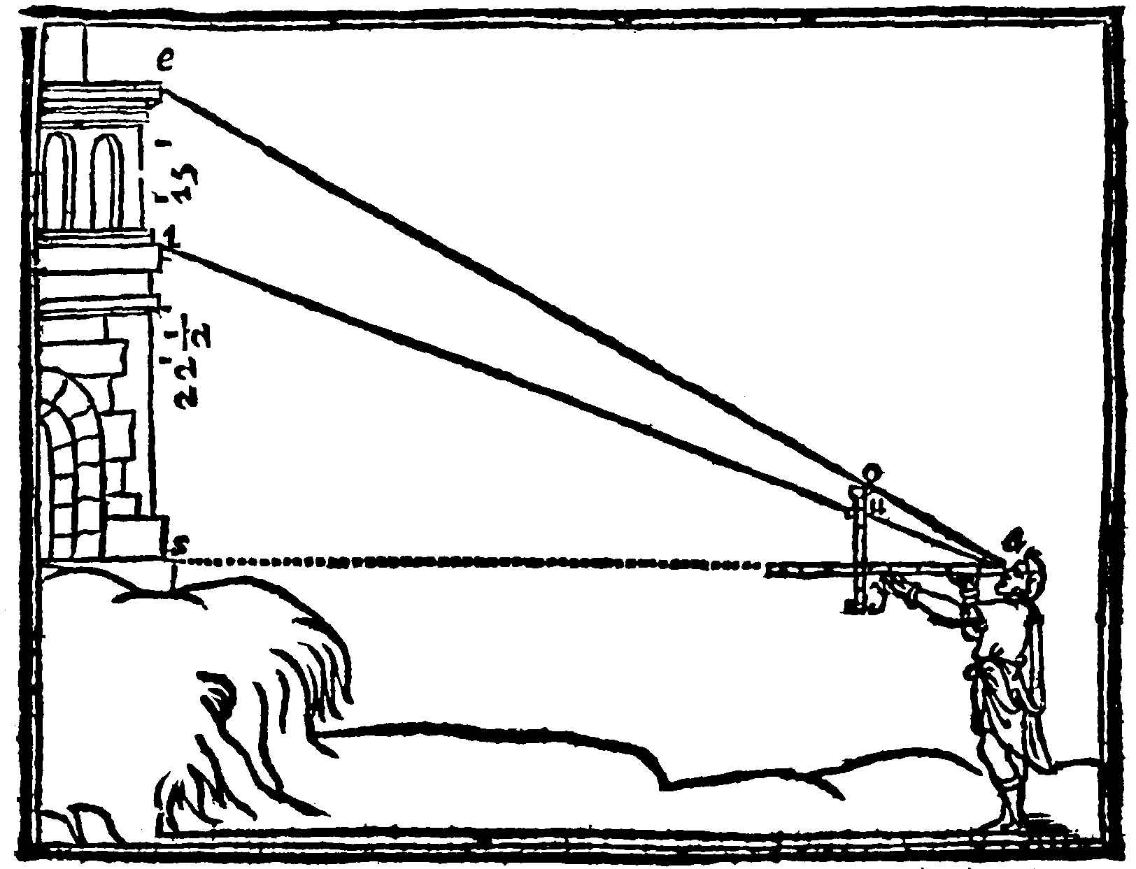 But this end of Geometry will appeare much more beautifull and glorious in the use and geometricall workes and [2]practise then by precepts, when thou shalt observe Astronomers, Geographers, Land-meaters, Sea-men, Enginers, Architects, Carpenters, Painters, and Carvers, in the description and measuring of the Starres, Countries, Lands, Engins, Seas, Buildings, Pictures, and Statues or Images to use the helpe of no other art but of Geometry. Wherefore here the name of this art commeth farre short of the thing meant by it. (For Geometria, made of Gè, which in the Greeke language signifieth the Earth; and Métron, a measure, importeth no more, but as one would say Land-measuring. And Geometra, is but Agrimensor, A land-meter: or as Tully calleth him Decempedator, a Pole-man: or as Plautus, Finitor, a Marke-man.) when as this Art teacheth not only how to measure the Land or the Earth, but the Water, and the Aire, yea and the whole World too, and in it all Bodies, Surfaces, Lines, and whatsoever else is to bee measured.