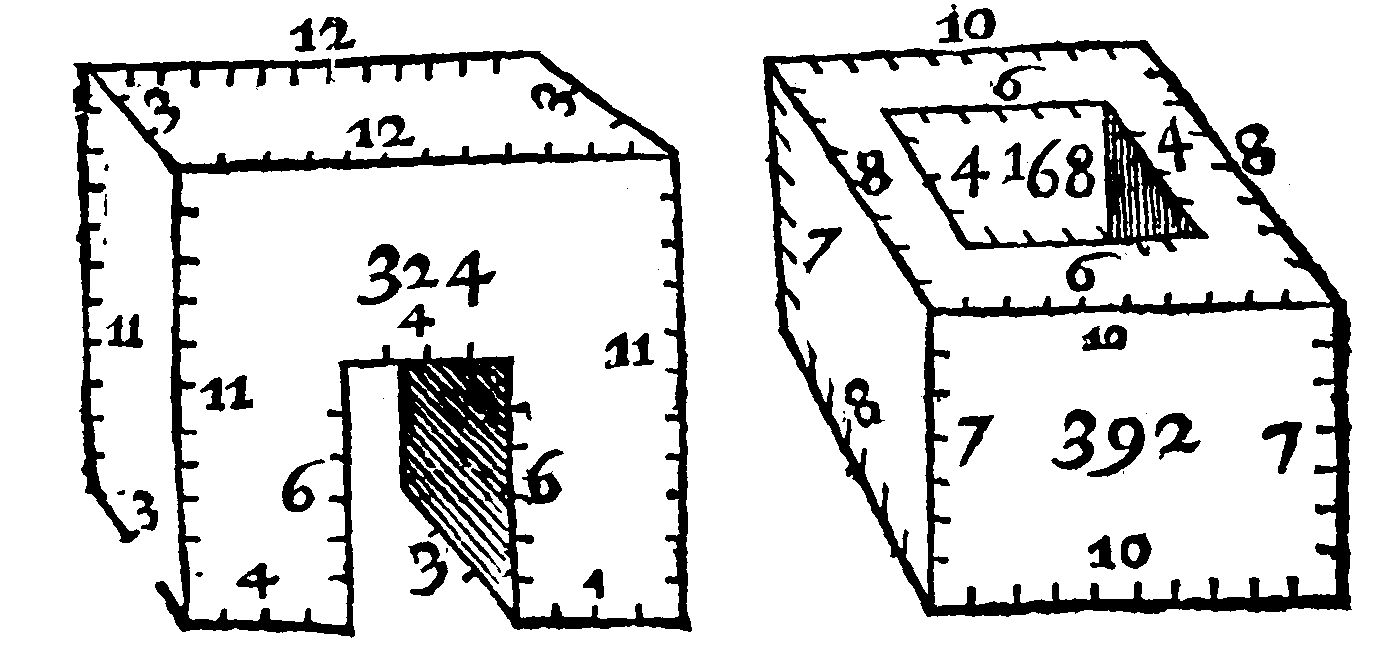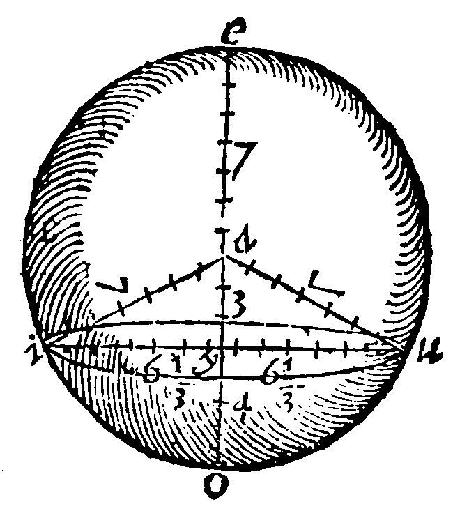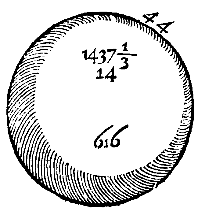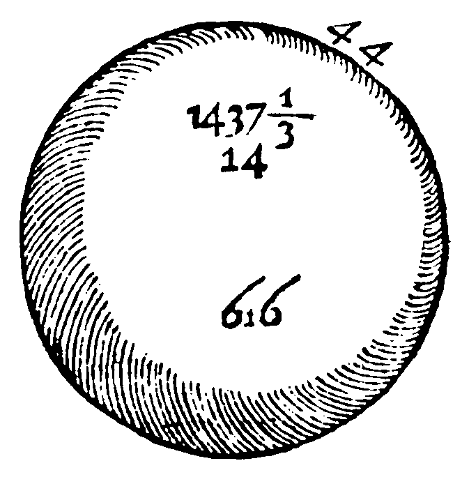As before there was an analogy betweene a Circle and a Sphericall: so now is there betweene a Cube and a spheare. A cubicall surface is comprehended of sixe quadrate or square and equall bases: And a spheare in like manner is comprehended of sixe equall sphearicall bases compassing the [286]cubicall bases. A cube is made by the multiplication of the sixth part of the base, by the side: And a spheare likewise is made by multiplying the sixth part of the sphearicall by the diameter, as it were by the side: so the plaine of 616/6 and 14, the diameter is 1437.1/3 for the solidity of the spheare.