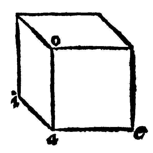 Let there be two plaines for a cube for all, that one quinquangle for twelve may be described, and they abutting one upon another, aeio, and euyi, having their sides halfed by the bisecantes, sr, lm, rn, jv: And the three bisegments or portions of the bisegments lm, and rn, neither concurring or meeting, nor parallell one to another; two of the said lm, to wit, fl, and fm: The third next unto the remainder, that is lr. And let each bisegment be cut proportionally in the points d, c, g; so that the lesser segments doe bound the bisecant, to wit, dl, cm, and gr. Lastly let there be three perpendiculars from the points db, cg, to the said d, cp, gz: And the two first knit one to another, by bp: And againe with the angles of the cube, by be, and pi: The third knit with the same angles, by ze, and zi: And let all the plaines be made up. I say first, that the five sides bp, pi, iz, ze, and eb are equall; Because, every one of them severally are the doubles of the same greater segment. For in drawing the right lines de and eg, ig, it shall be plaine of two of them; And after the same manner of the rest. First therefore cd, and bp, are equall by the 6 e xxj, and by the 27 e v. Therefore bp, is the double of the greater segment. Then the whole fl, cut proportionally, and the lesser segment dl, they are by the 7 e xiiij, of treble power to the greater fd, that is, by the fabricke db. Therefore le wich is equall to lf, the line cut, and ld, are of treble power to the same db: But by the 9 e xij, de is of as much power as le, and ld too. [281]Therefore de is of treble power to db. Therefore both ed, and db, are of quadruple power to db. But be, by the 9 e xij, is of as much power as ed, and db. And therefore be, is of quadruple value to db: And by the 14 e xij, it is the double of the said db. Therefore the two sides eb, and bp, are equall: And by the same argument pi, iz, and ze, are equall. Therefore the quinquangle is equilater.