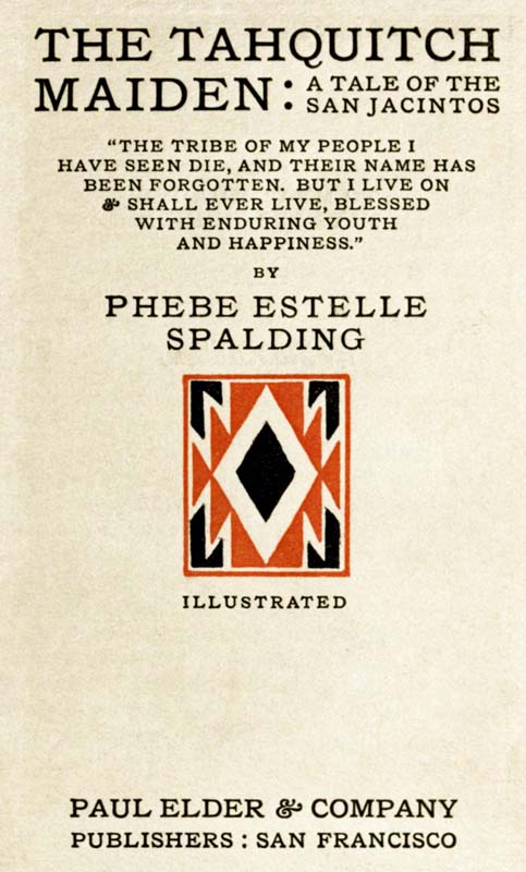 HERE ENDS THE TAHQUITCH MAIDEN A TALE OF THE SAN JACINTOS TOLD BY PHEBE ESTELLE SPALDING. THE DECORATIONS BY JEAN OLIVER. PUBLISHED BY PAUL ELDER & COMPANY AND PRINTED FOR THEM BY THEIR TOMOYE PRESS, UNDER THE DIRECTION OF JOHN HENRY NASH, IN THE CITY OF SAN FRANCISCO, DURING THE MONTH OF JULY AND YEAR MCMXI.