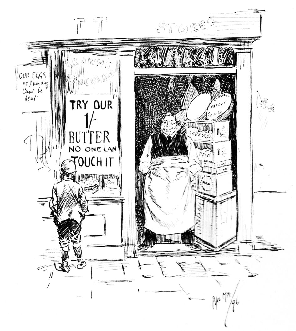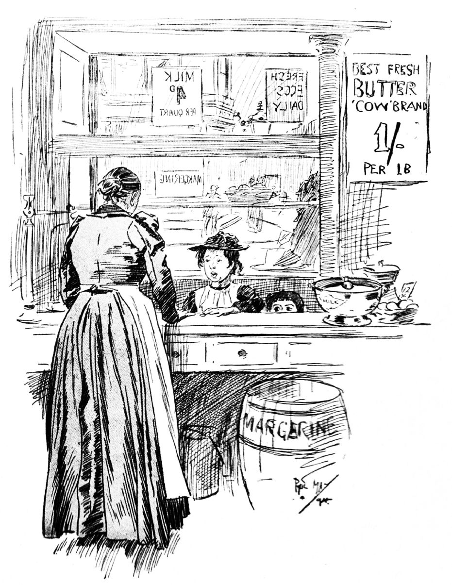 “’Arf a pound er Margarine, please; an’ Mother says will yer put the Cow on it cos she’s got Company!”
