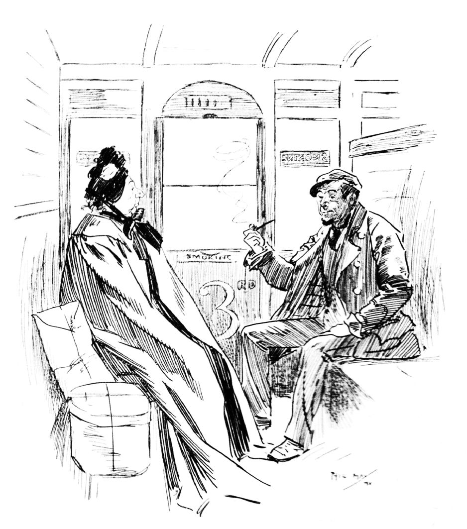 Workman (politely, to old Lady, who has accidentally got into the Smoking Compartment). “You don’ object to my Pipe, I ’ope Mum?”