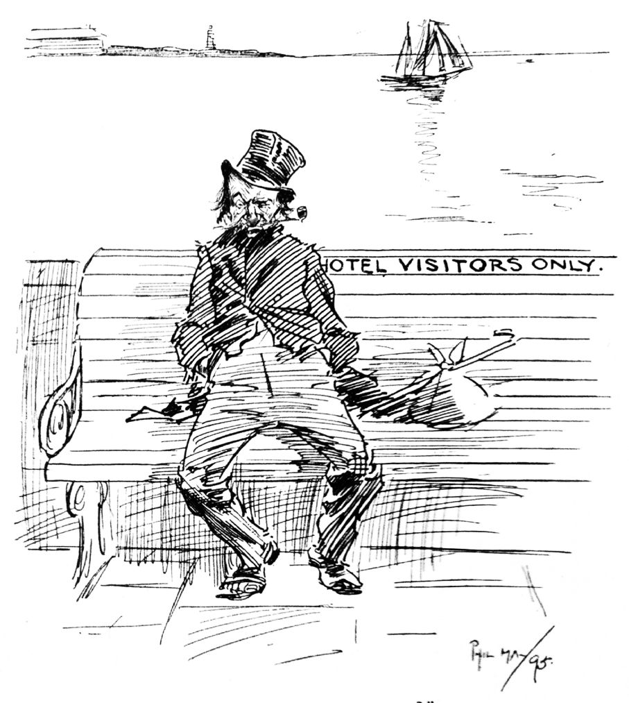 Seedy American. “Waal, guess I don’t think so durned much of your Thames Embankment, neither. It rained all the blarmed time the night I slep on it.”