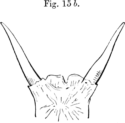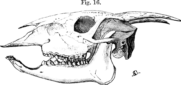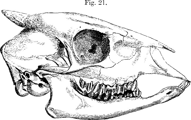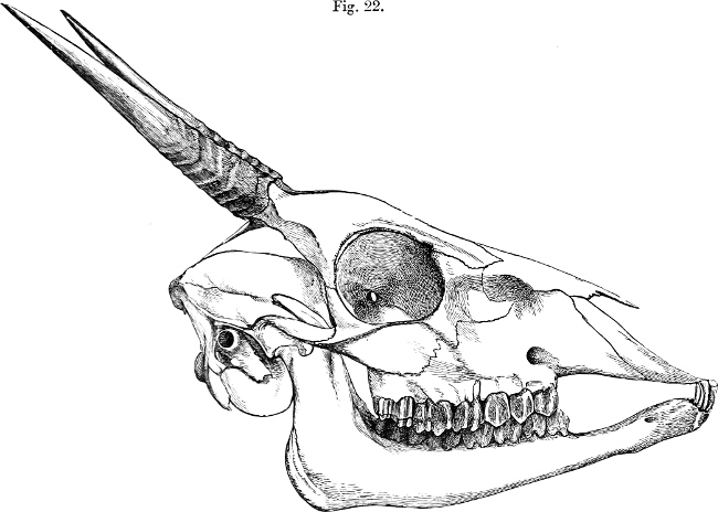 Horns normally present only in male. These (see fig. 22, p. 207) are set up at a considerable angle to the line of the nasal profile, slender, tapering, attaining to about 5 inches in length, their bases roughened but not markedly thickened, their greatest basal diameter going about 6 or 7 times in their length.