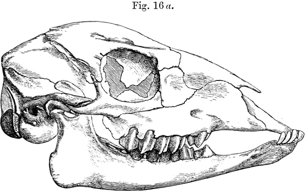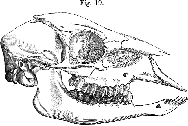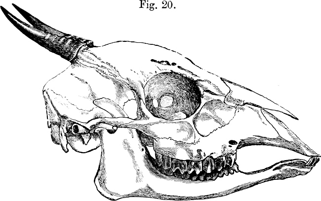[2] The term anteorbital gland denotes the so-called "tear-bag” which opens on the face of many Antelopes and Deer. The lachrymal pits are placed in a depression of the skull below the orbit of the eye in the lachrymal bone, and contain the above-mentioned gland. The lachrymal vacuity is a larger or smaller aperture between some of the component bones of the skull, situated near the lachrymal pit and at the base of the nasal bones, which form a thin roofing over the cavity of the nose. The term supraorbital pits is applied to deep excavations in the forehead of the skull between the eyes, which lead into perforations traversing the thickness of the bone. The molar teeth are the last three teeth on either side of each jaw.