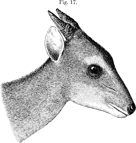 North of Nyasaland the Duiker appears to extend across German East Africa into British East Africa, where it is well known to the sportsmen of the Kilimanjaro district. Mr. F. J. Jackson, in ‘Big Game Shooting,’ tells us that it is found throughout British East Africa, and extends as far west as Kavirondo. Herr Oscar Neumann informs us that he has obtained it in Uganda. At Taveta it frequents the low stony hills covered with long[210] grass and short scrub. On the coast it is found in open bush country and also in low scrub and grass. A skin in the British Museum is stated to have been obtained as high up as 10,000 feet on Kilimanjaro. Until recently we have believed the northern range of the Duiker not to extend beyond British East Africa; but quite lately Mr. F. Gillett, who accompanied Dr. Donaldson Smith during the first part of his adventurous expedition through Somali-land towards Lake Rudolph, has met with the Duiker on the confines of Galla-land. Mr. Gillett has favoured us with the following notes on this species:—