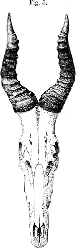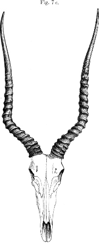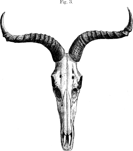 Skull and horns as described above (p. 213). Dimensions of an adult male skull: basal length 6·5 inches, greatest breadth 3·2, muzzle to orbit 3·65.
