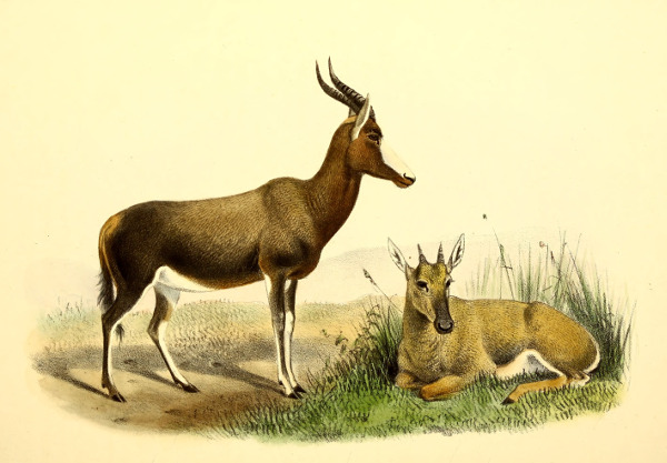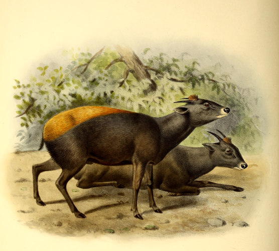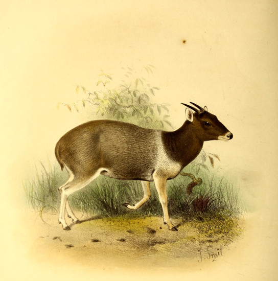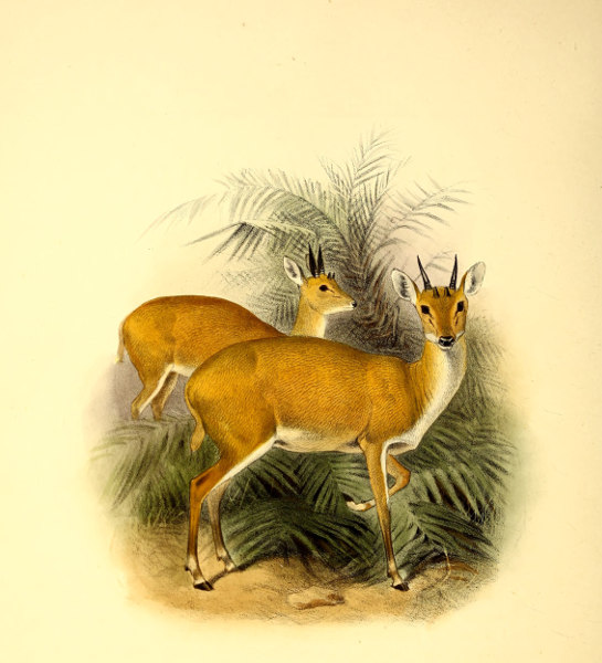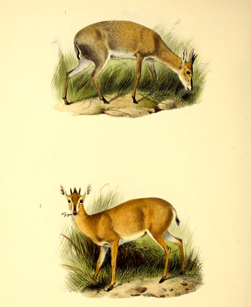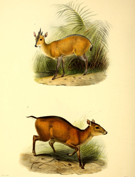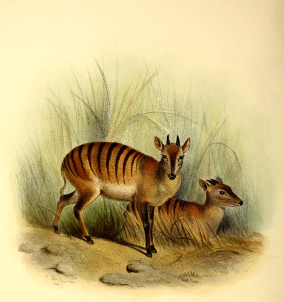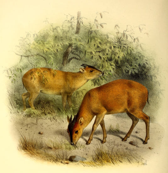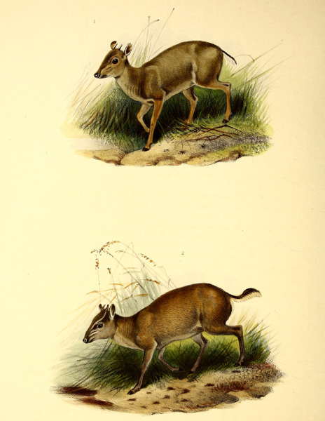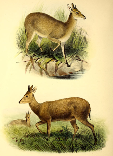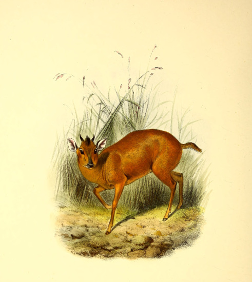 The little Antelope called at the Cape the “Duiker” or “Diver,” not from its going into the water, but from its “diving” so quickly into the bushes when alarmed, has been more or less perfectly known to the naturalists of Europe for the past 200 years. Described by Grimm in 1686 as the Capra sylvestris africana it was dedicated to that naturalist by Linnæus, when he adopted the binomial system, as the Capra or Moschus grimmia. This term, slightly modified in accordance with modern usage, we propose to adopt as its specific name. Other early names bestowed upon it were Antilope nictitans by Thunberg, of whose travels to the Cape we have already spoken, and Antilope mergens by Blainville, while various appellations, which are specified in our synonymy, were given to this species and its varieties by Andrew Smith, Hamilton Smith, Gray, and Fitzinger.