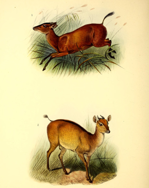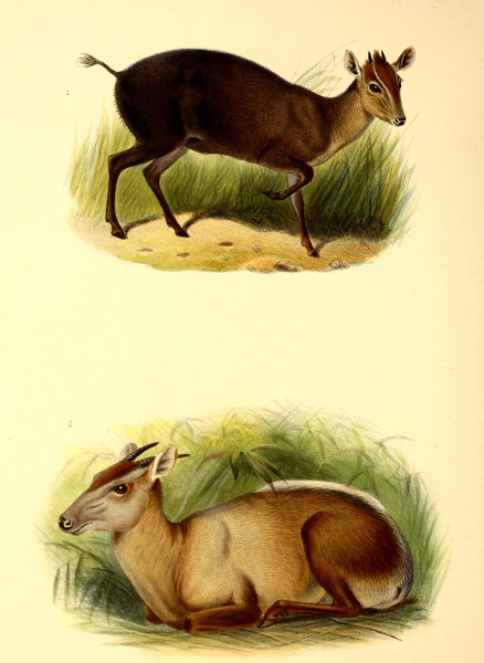 Our two illustrations of the Common Duiker (Plate XXIII.) were prepared by Mr. Smit under the direction of the late Sir Victor Brooke. The lower figure represents the more uniformly-coloured and typical form; the upper shows the variety which has been called ocularis and is known by its more rufous head, whitish eye-stripe, and much paler inferior surface.