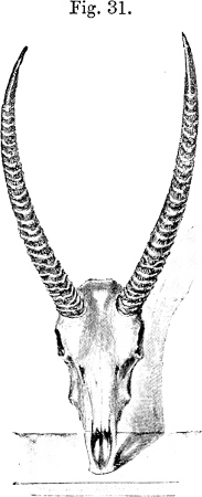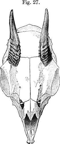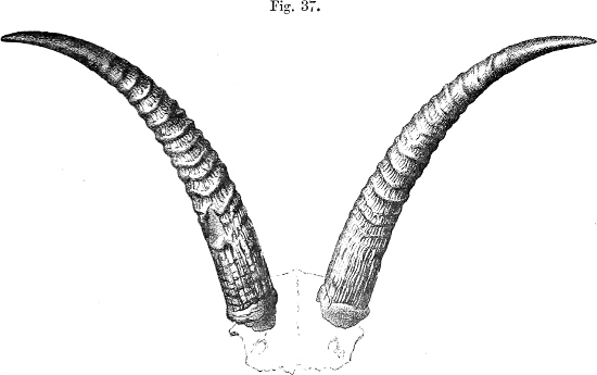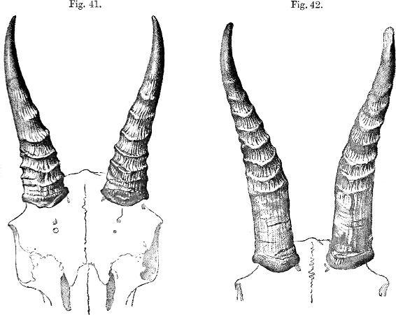 The change of shape of the horns in the Antelopes as the animals grow older, so frequently referred to in this work, is well marked in the present species, and we have therefore thought it worth while to illustrate these differences by figures (figs. 41 and 42). Figure 41 represents the horns of a young, or rather just adult, male, in which they have attained a length of about[182] 6¼ inches, and are evenly curved upwards to their slender points. Figure 42 shows those of an aged specimen, in which it will be seen that the sharp slender point has got more worn down, while at the same time a long straight basal portion has been added below. This change causes such a difference in the general appearance of the horns that authors have in many cases been led to suppose that the extremes represent different species. We therefore take the opportunity of pointing out how deceptive such appearances are, and how careful writers should be when they found species mainly on the characters presented by the horns. At the same time, the perfect identity of the curves in the part that is common to both specimens is very noteworthy, and shows how valuable horn-characters may be when skill and care are exercised in using them.
