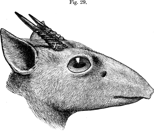 After the description was made the specimen was unfortunately sent off to America before we had time to make a special examination of it. In reply to our enquiries, however, Mr. F. W. True, of the U.S. National Museum at Washington, has most kindly forwarded to us a large-sized black-and-white drawing of the head of this species, from which the accompanying reduction (fig. 43, p. 184) has been made by photography. In the absence of a coloured figure, this we trust will serve to make Chanler’s Reedbuck, if rediscovered, more easily recognizable by future travellers.