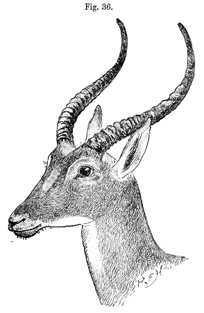 Mr. Chanler’s specimen of this Reedbuck was placed in the hands of Messrs. Rowland Ward & Co., of Piccadilly, for the purpose of being mounted,[185] and there attracted Mr. Ward’s special attention, as he had previously seen a flat skin somewhat similar, and had called Mr. Chanler’s attention to it before his departure on his expedition. Before sending the specimen to its destination in the United States National Museum at Washington, Mr. Ward showed it to Mr. Walter Rothschild as probably belonging to an undescribed species, and shortly afterwards Mr. Rothschild dedicated it to its discoverer in a paper published in the second volume of ‘Novitates Zoologicæ,’ with the following characters:—“This new species belongs to the group of the smaller species of Cervicapra, and is nearest to C. bohor, but much the smallest of the genus. Perhaps the most striking difference to the ordinary observer is the central black stripe running from the nose to between the eyes. Head and neck generally orange-buff, as in C. bohor; back, sides of body, upperside of tail, and outer sides of limbs warm buffy grey, instead of being of the same colour as the neck, as in C. bohor and C. redunca. Belly, underside of tail, and inside of limbs down to the knees white. Just below the knee in front is a dark brown patch. The ears seem to be longer and narrower in proportion than those of C. bohor; they are sparingly covered on the outside with short hair of the colour of the neck, and inside thickly lined with long white hair. The horns are much smaller and thinner than those of C. bohor, and much more so, of course, than those of C. redunca, both of which are much more curved forward. The rings on the horns project much more and are much sharper than in my specimens of C. bohor and C. redunca, and are also much more regular. They are five in number, besides the basal ring.”