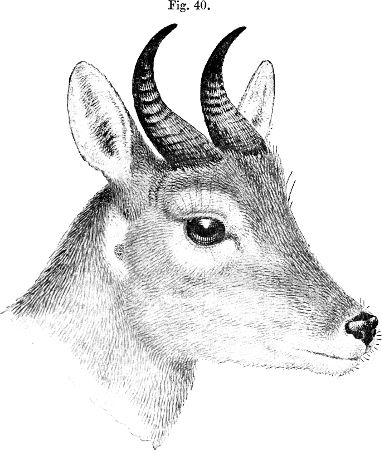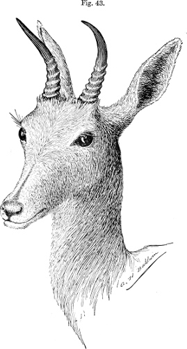 The Rhébok seems to be impatient of captivity and is very seldom brought to Europe alive. The register of the Zoological Society of London contains the record of only four examples as received, two of which were transmitted by Sir George Grey from the Cape in 1861. These were both females; but a male was presented by Mr. E. R. Wodehouse in 1863, and a female was obtained by purchase in 1864. During his many visits to the continental menageries, Sclater does not recollect to have observed a single individual of this Antelope. Besides a stuffed pair of adults of this species in the Gallery of the British Museum, from the male of which our drawing of the head (fig. 44, p. 193) has been taken, there are a skin and several skulls from the Burchell and other collections. But fresh specimens of this Antelope would be desirable acquisitions.
