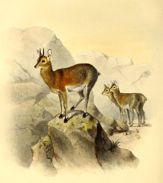 In the days of Harris (1836–37) we learn from his ‘Portraits’ that the “Rhébok,” as he calls it, was extremely common throughout the Cape Colony, even in the more thickly inhabited cantons. “Never entering the forest,” he tells us, “but residing chiefly among rocky glens and mountain-passes, the Rhébok inhabits the vicinage of little stagnant pools that have[192] been left by the winter torrents, where small families, comprising one old male and five or six females with their fawns, may frequently be seen grazing quietly on the bare hillsides or gambolling amongst the dwarf trees and underwood. To guard against surprise a vidette is invariably on the alert; and should a human figure or other suspicious object be descried nearer than is judged to be safe, the wary sentinel forthwith extends her slender neck, and gives warning to her companions by a sharp sneeze. Away they all bound, lightly as the wind, tossing their graceful heads, whilst their dainty feet scarcely seem to touch the earth; and never slackening their pace until they have gained the summit of some distant eminence, they halt as if by word of command, and suddenly facing half round, reconnoitre the enemy. Exceedingly shy and possessed of a keen scent and a hawk-vision, it is difficult enough to approach within rifle-range; but the little herd, when thus in motion, usually winding round the base of a hill instead of taking directly up the acclivity, an opportunity is often presented to the pursuer to gallop across the path they have selected, and thus obtain an easy snap-shot.”