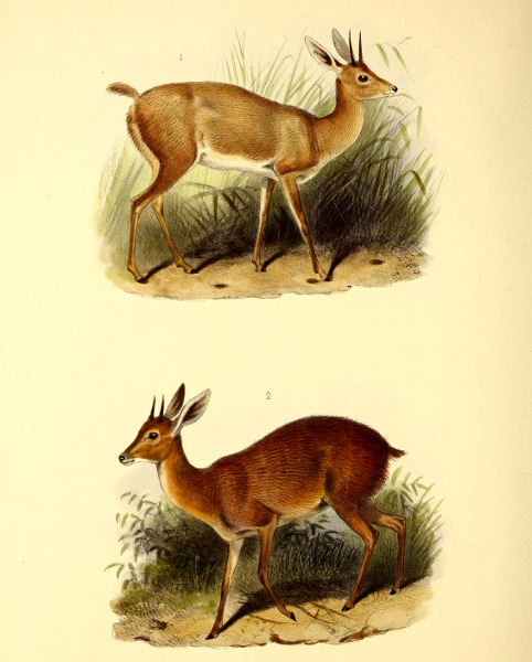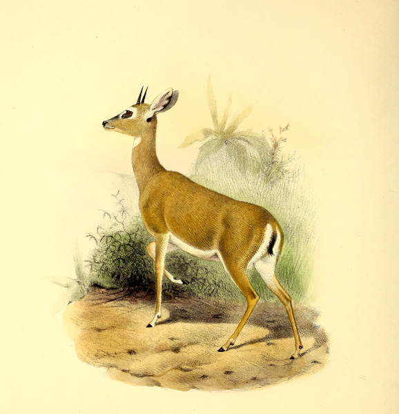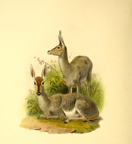 The earliest recognizable figures of the Vaal Rhébok were published about 1829, when Lichtenstein gave representations of both sexes in his ‘Darstellung der Thiere’ from specimens in the Berlin Museum.