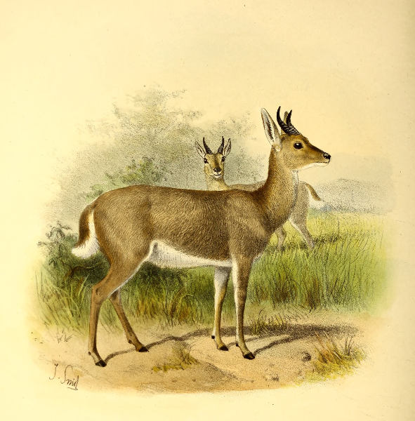 Our figure of this Antelope (Plate XLV.) has been taken by the kind permission of Mr. W. L. Sclater from a specimen of this species belonging to the South-African Museum at Cape Town, which had been sent home to Mr. Edward Gerrard of Camden Town to be mounted. It is an adult male and was obtained by Dr. D. R. Kannemeyer near Burghersdorp in the Cape Colony on the 28th May, 1894. The specimen stands about 27½ inches high at the shoulders, and the body from the nape to the rump measures about 29 inches. The tail is very bushy, and measures at least 9 inches to the end of the hairs. The bare spot beneath the ear is very observable. The general colour of the specimen is well shown in Mr. Smit’s figure.