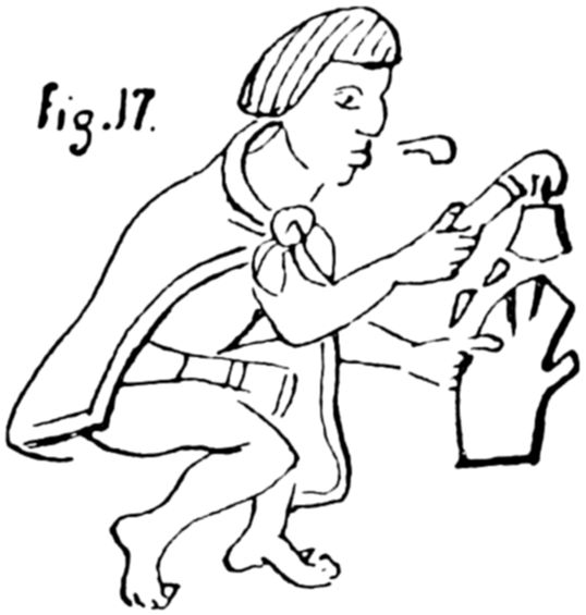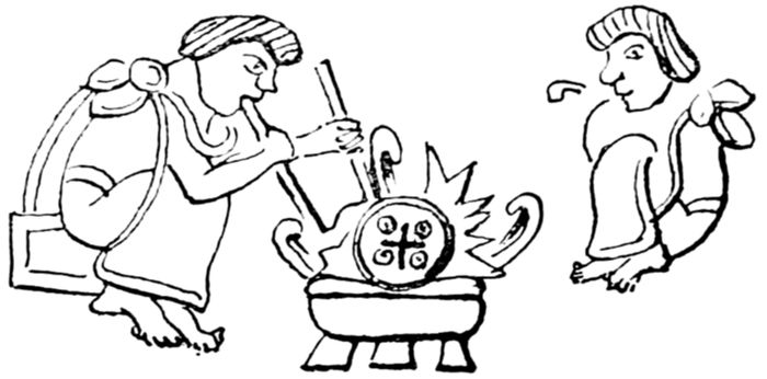 But before these ores could be shaped into the above named commercial forms, it is clear that they still needed to undergo a process of smelting. As to the peculiar mode of smelting pursued by the natives, we have not been able to find any distinct reference in the writings of the chroniclers. It does not appear that the ancient Mexicans understood the method of the Peruvians of melting their copper in furnaces exposed to the wind on the lofty sierras, but we may form for ourselves an idea of how they proceeded from a picture in Codex Mendoza, page 71, fig. 24.