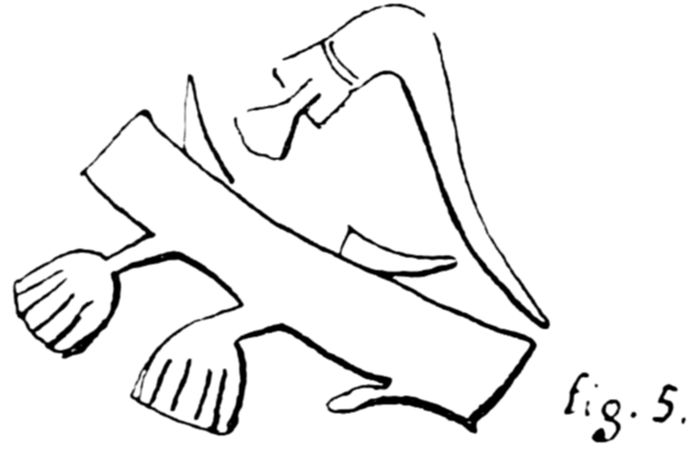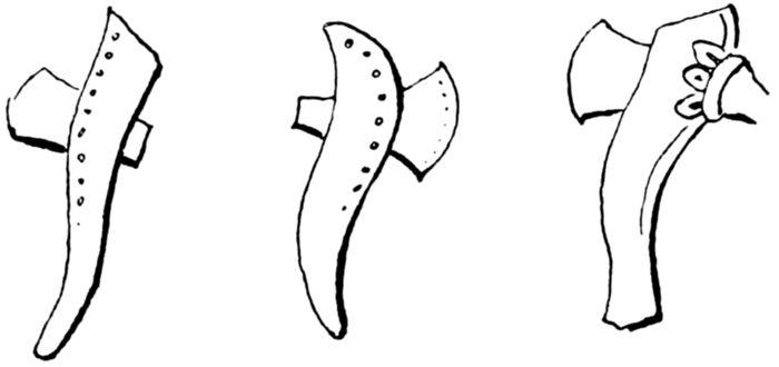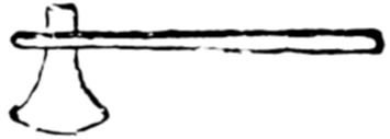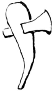 There cannot be any doubt as to the meaning of the objects represented by these pictures. They mean axes. Their handles appear in a curved form, the blades at their cutting edges are somewhat rounded, and the tenons of the blades are inserted below the top of the handles. Both handles and blades are painted in a reddish brown color, the wood as well as the copper.