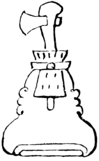 The differences between the pictured representations are the following: Cuts 1, 2, and 4, show the axes growing out from the top of a mountain, whilst the axe of cut 3 appears by itself. Further, the axes of cuts 1 and 2, those of Tepoztla, show something applied to the handle, which in cut 1 we recognize to be a single bow-knot, and in cut 2 the same girdle with a bow-knot, yet wound about a dress of white color, embroidered with red spots. A notable difference, however, will still be noticed between the form of the axes in cuts 1, 2, 3, and that in cut 4, or Tepozcolula. We shall speak of this latter, on a later page, as an instrument very closely related to the other axes.