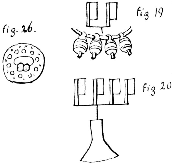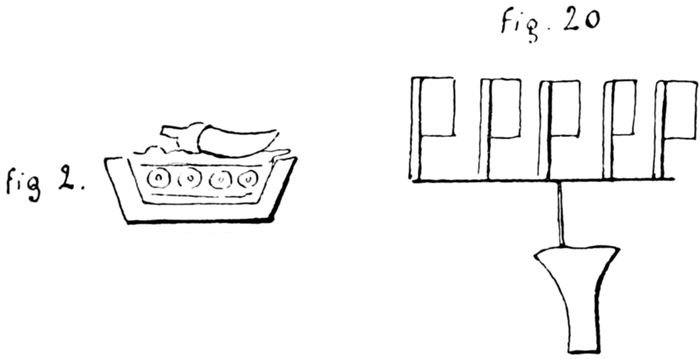 In like manner we may proceed with the definition of the picture found on page 42, fig. 20. The copy given in cut 6, shows 80 blades of copper axes in fig. 20, and besides 40 little copper bells in fig. 19, and the interpretation, Vol. V., page 76, informs us that it was the town of Chala, fig. 26, which had to pay this kind of tribute.