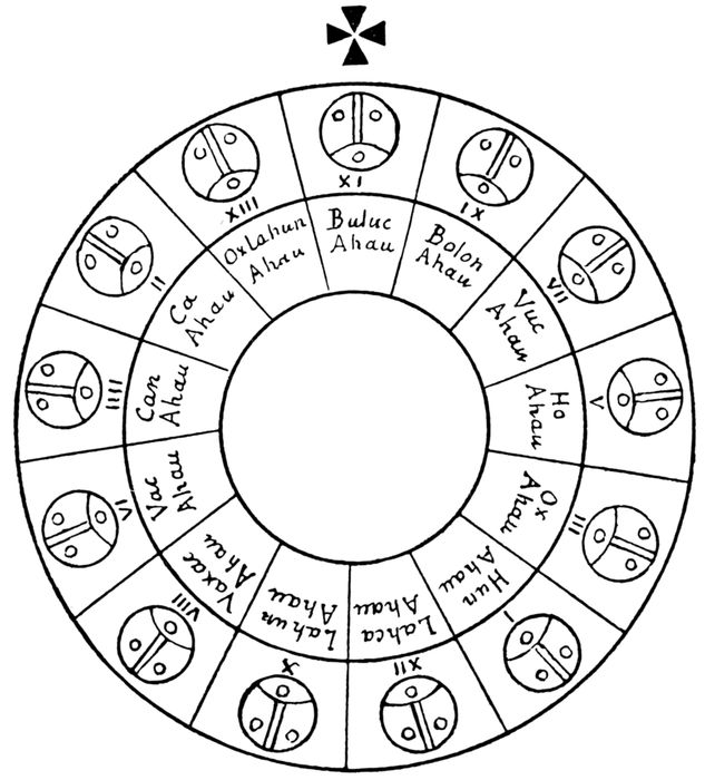 37. A specimen of such an instrument with a surface inscribed as the cut shows would hardly have been preserved. We think that the box enclosed a round disk turning on a pivot; this contrivance, evidently served as an aid to the memory in enumerating the alternating Ahaues. To-day, we should obtain the same result by writing the Ahaues in a horizontal or vertical line, but the Nahuatls and Mayas, having solely a symbolical or pictorial manner of representation, made use of this ingenious arrangement by painting the series of the Ahaues on the circumference of a circle. Thus the idea of an uninterrupted sequence of time and the connection of the 2d Ahau with the 13th were brought to notice.