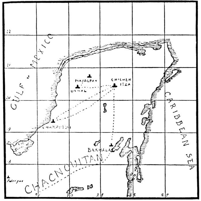 44. E. Ancona, Historia de Yucatan, Vol. I., page 34. Mérida, 1879.—“The word Chacnovitan or Chacnouitan first appeared in the Maya MSS. or series of Maya epochs. Upon examining this document, and observing that the tribe wandered from Tulapan to Chacnouitan and later to Bakhalal and from there to Chichen-Itza, etc., it will be understood that the name in question was given to no other portion of our peninsula than to that which lies at the south. Brasseur de Bourbourg supposes, and we think not without reason, that Chacnouitan lay between Bakhalal and Acallan, s. e. of the Laguna de los Terminos.—See Brasseur de Bourbourg, Archives de la comission scientifica, Tomo. I, page 422, note 2.”