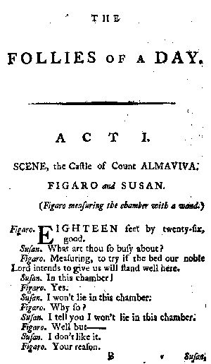 Readers are divided into two Classes; the one will allow an Author much more than he merits, and the other much less; but the principal Excellencies of The Follies of a Day are so known to be another’s Right, that for me to claim them would be ridiculous. Some, however, have affirmed that it is a mere Translation, who have never seen, read, or heard the Original; if they had, indeed, they would have been still more culpable. Few will trouble themselves to examine the precise Extent of my Claims; nor, if they did, would they have an Opportunity ’till M. de Beaumarchais shall think proper to publish La Folle Journée. The Public in general are so willing to overlook Defects, and applaud wherever they can, that to complain of, or be angry at the Few who seek for, and wish to find, Errors only, can proceed alone from that Self-love which is so inherent and[v] irritable in all bosoms, and so difficult to subdue.