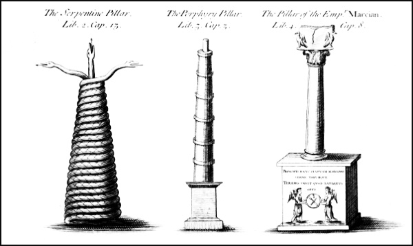 IX. The Three Pillars, viz. the Serpentine and Porphyry Pillars, standing in the Hippodrom, as described by Gyllius, with the Pillar of the Emperor Marcian, since discover’d by Spon and Wheler in a private Garden; from B. Randolph.