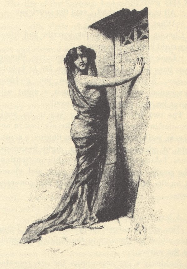 The day was waning. She sat up in the piscina, stepped out of the water, and walked to the door. Her foot-marks shone upon the stones. Tottering, and as if exhausted, she opened the door wide and stopped, holding the latch at arm’s length; then entered, and, standing upright near her bed, and dripping with water, said to the slave: