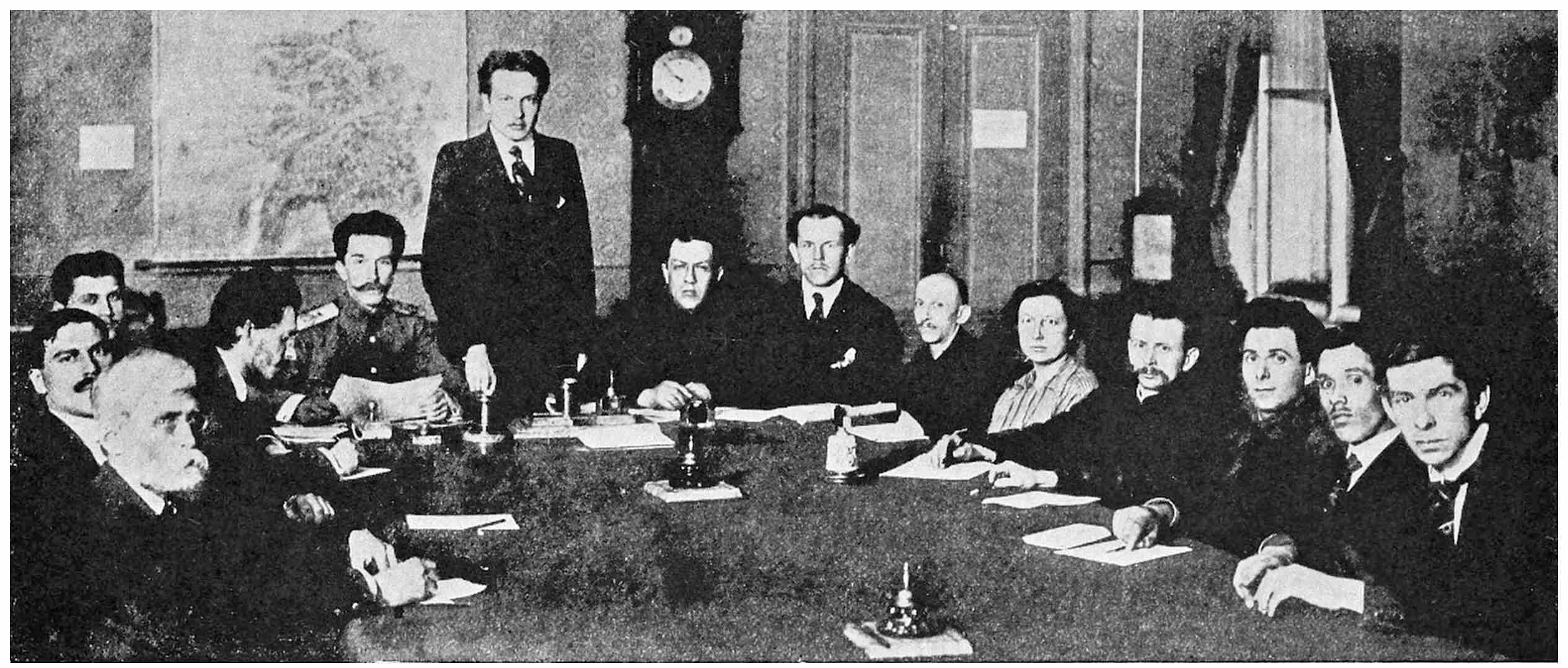 Mr. Rodzianko was about the last man whom one would have suspected of being possessed of the necessary determination to resort to a “Coup d’Etat.” He was a Chamberlain of the Czar; he had been brought up in monarchical traditions, and during his whole277 life he had submitted to the one which, in Russia, placed the Sovereign in the light of something holy and sacred before his subjects. He was respected but did not enjoy an immense authority in the Chamber that had never taken quite kindly to him, not thinking him possessed of sufficient courage to fight its battles with efficiency. It is probable that he felt terrified rather than anything else, at the prospect which the communication of Mr. Kerensky opened before him, but things had advanced too far for him to be able to withdraw. There was no alternative left but to perish oneself, or to destroy others. Mr. Rodzianko called together a meeting of several deputies belonging to the moderate parties, with whom he discussed the situation. They very quickly came to the conclusion that if one entered into a struggle with the government in this all important question of war and peace, one would be backed up by the whole country, which did not wish to see the war come to an end until the enemy had been driven out of Russian territory. There was also another thing which added itself to all the different questions roused by the discovery of the intentions of the Court. It was the determination of the radical groups of the Duma to proceed to the “Coup d’Etat” on their own accord, and no matter under what conditions, with or without the help of the moderate elements in the Assembly. This might have become extremely dangerous, as they had behind them the whole mass of the working population of the capital. The question had therefore to be considered as to whether the Revolution was to be made with the concurrence of all the parties represented in278 the Duma, or by the radical socialists alone, who, in the latter case, would have become the absolute masters of the situation, and might have pressed for the immediate proclamation of a Republic which could easily have degenerated into an anarchy, and which in the best of cases would have lacked the necessary dignity, capable of giving it prestige and authority at home and abroad. Mr. Rodzianko found himself placed in the presence of a dilemma of a most difficult kind and nature. He took the only decision possible under the circumstances, he boldly placed himself at the head of the movement and constituted a provisional government, in place of the one that had foundered under the weight of the contempt of the whole nation.