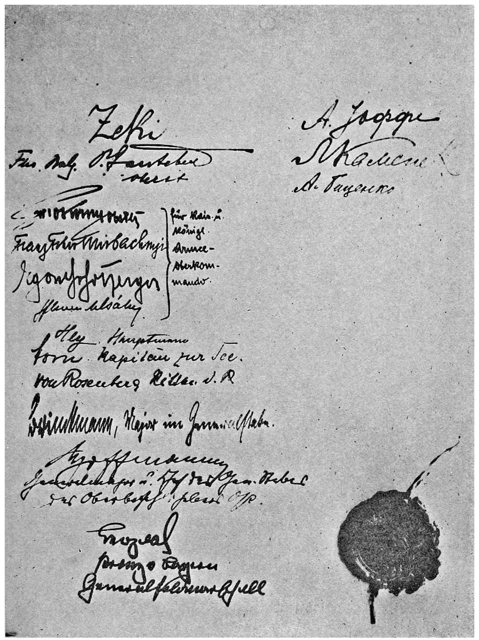 The delegates looked at each other, and Schoulguine remarked that they were not prepared for this complication, and that he begged permission to consult with his colleague. But after a short conversation they gave up the point, as Goutschkoff remarked that he did not think they had the right to mix themselves up in a matter where paternal feelings and affection came into question, and that besides a regency had also much to say against it, and was likely to lead to complications. The Emperor seemed satisfied that the delegates had conceded the point, and then he asked them whether they could undertake to guarantee that his abdication would pacify the country and not lead to any disturbances. They declared that they could do so. Upon this he got up and passed into another compartment of his railway carriage. In about half an hour he returned, holding in his hand a folded paper, which he handed over to Goutschkoff, saying as he did so: “Here is287 my abdication, will you read it?” After which he shook hands with the delegates and retired as if nothing unusual had happened, perhaps not realising that with one stroke of his pen he had changed not only his own life, but the course of Russian history, and, in a certain sense, destroyed the work of his glorious ancestor, Peter the Great.