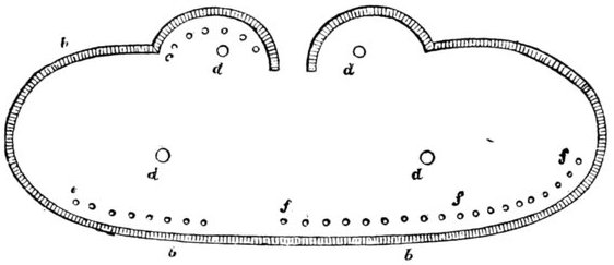 It was nearly nightfall when we reached the Manitari village, the large huts of which were built so close to each other that it was sometimes difficult to pass between them. We heard loud lamentations as we approached, and learnt that a child had just died, and that a corpse had been deposited, a few days before, on poles placed in the boughs of a tree. At the farther end of the village was the residence of Mr. Dougherty[15] a long, low, log-house, divided into three apartments, of which that in the centre was used for a storehouse, the northern apartment being assigned to the family, and the southern to the engagés. We were received with much kindness, and, being thoroughly tired by a fatiguing journey of, at least, nine leagues, we were truly glad to rest our weary limbs before a blazing fire. A number of Manitari Indians were assembled, who, however, gradually retired whilst we took some refreshment, not having tasted anything since we breakfasted at Fort Clarke. It being reported that herds of buffaloes were at no great distance, a party of Indians resolved to give them chase on the following day, and to implore the blessing of heaven upon their undertaking by a great medicine feast. Notwithstanding the pain I suffered in walking, the prospect of witnessing so novel a scene was so exciting that I immediately set out about seven o'clock in the evening, accompanied by Dougherty and Charbonneau, to see the Indian ceremony, which was instituted by the women. Between the huts, in the centre of the village, an elliptical {420} space, forty paces or more in length, was enclosed in a fence, ten or twelve feet high, consisting of reeds and willow twigs inclining inwards.[16] An entrance was left at a; b represents the fence; d are the four fires, burning in the medicine lodge, which were kept up the whole time. At e the elder and principal men had taken their seats; to the right sat the old chief, Lachpitzi-Sihrisch (the yellow bear); some parts of his face were painted red, and a bandage of yellow skin encircled his head. Places were assigned to us on the right hand of the yellow bear. At f, close to the fence, the spectators, especially the women, were seated: the men walked about, some of them handsomely dressed, others quite simply; children were seated around the fires, which they kept alive by throwing twigs of willow trees into them. Soon after Charbonneau had introduced us to this company, six elderly men advanced in a row from the opposite hut, and stopped for a moment at the entrance of the great medicine lodge.