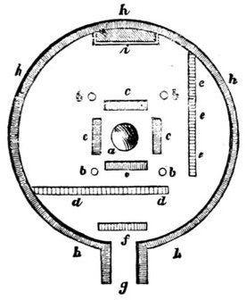 Having been invited by the Indians to the winter village, to be present at a great medicine feast, we proceeded thither, on the 3rd of December, in the afternoon. Mr. Kipp took his family with him, and Mato-Topé and several other Indians accompanied us. We were all well armed, because it was asserted that a band of hostile Indians had been seen among the prairie hills on the preceding day. Our beds, blankets, and buffalo skins were laid on a horse, on which Mr. Kipp's wife, a Mandan Indian, rode. Thus we passed, at a rapid pace, through the prairie, along the Missouri, then below the hills, which are pretty high; and I cannot deny that, in the valleys and {426} ravines, through which some small streams that we had to pass flowed, our whole company looked anxiously to the right and left to see whether any enemies would issue from their ambush. We had to pass a narrow gorge behind a little thick copse, where many Indians had been killed by their enemies. After proceeding about an hour and a half we reached the village in the wood, which is the winter residence of the inhabitants of Mih-Tutta-Hang-Kush. We stopped at the hut of Mr. Kipp's father-in-law, Mandeek-Suck-Choppenik (the medicine bird), who accommodated us with a night's lodging. The description of this hut may serve for all the winter huts of these Indians.[21] It was about twenty paces in diameter, and circular: h is the fence or wall of the hut, supported inside by strong, low posts, on which rests the vaulted roof, which has a square hole to let the smoke escape; g is the entrance, protected by two projecting walls covered above. At f is the door, consisting of a piece of leather stretched on a frame. At d d there is a cross wall of considerable height, made of reeds and osier twigs woven together, to keep off the draught of air. At e e e there is another cross wall, only three feet high, behind which the horses stand; a is the fireplace, round which, at c c c c, are the seats of the inmates, consisting of [Pg 40]benches formed of basket-work, covered with skins; b b b b are four strong pillars which bear the roof, and are very well united above by cross beams. At i there was a large leather case for the beds in which the family slept. A chain, with a large kettle, was suspended from the roof over the fire, to cook our supper, consisting of very pleasant flavoured sweet maize. The master of the hut was absent, but his wife, daughter, and son-in-law, received us very kindly. We had still a little time before the commencement of the medicine feast, which consisted of the dance of the half-shorn head, which the soldiers sold to the raven band. This feast was to last forty nights, and the son-in-law of our host was among the sellers. We sat around the fire and smoked, while the drum was beat in the village to call the two parties together. After seven o'clock we repaired to the medicine lodge; it was entirely cleared, except that some women sat along the walls; the fire burned in the centre, before which we took our seats, near the partition d d, with several distinguished men of the band of the soldiers. At our left hand, the other soldiers, about twenty-five in number, were seated in a row; some of them were handsomely dressed, though the majority {427} were in plain clothes. They had their arms in their hands, and in the centre were three men, who beat the drum. On the right side of the fire stood the young men of the raven band, who were the purchasers; they were obliged to satisfy the soldiers, who were the sellers, by making them valuable presents, such as horses, guns, powder and ball, blankets of different colours, kettles, &c.; to continue the feast forty nights; to regale them, for that time, with provisions and tobacco, and offer their wives to them every evening. The soldiers had consented to these terms, and the festival took place every evening in the following manner:—
